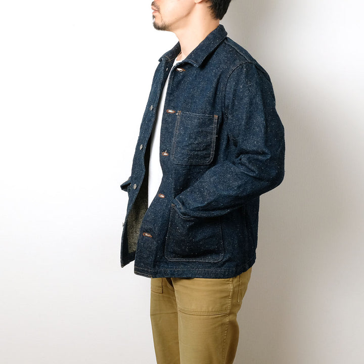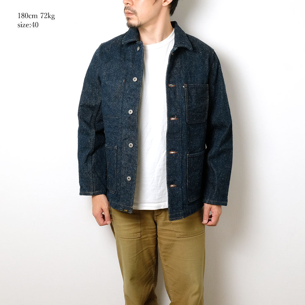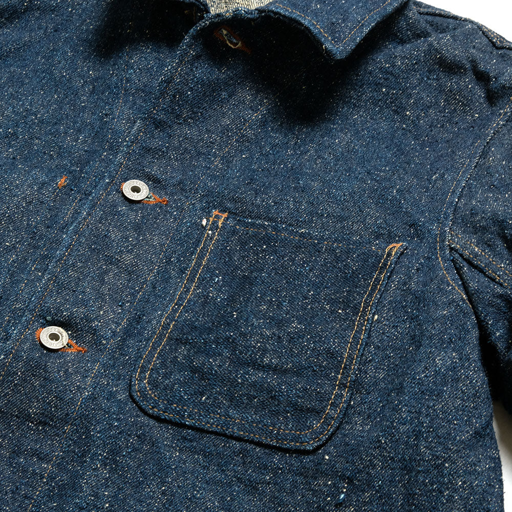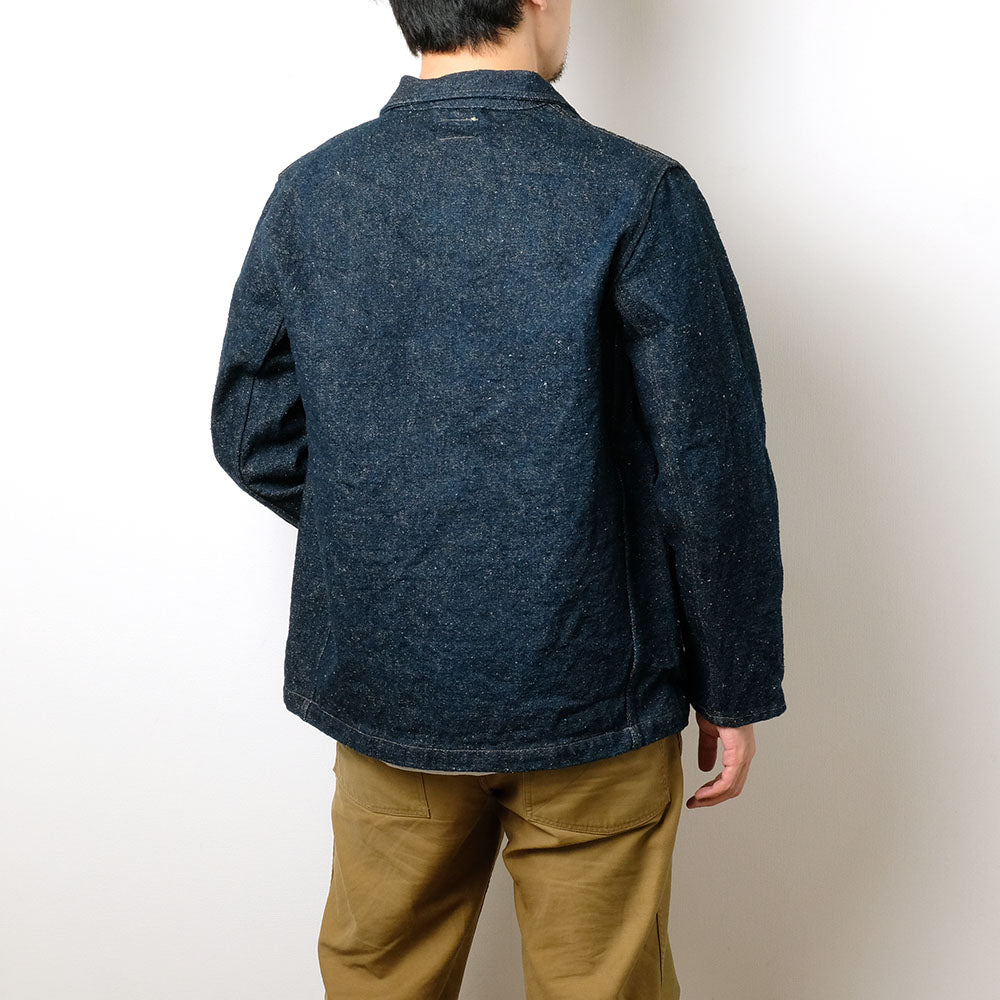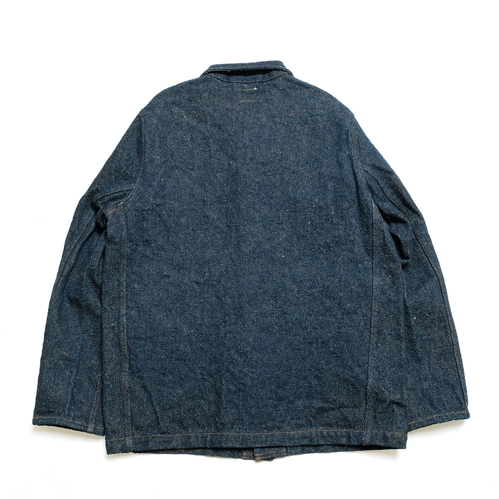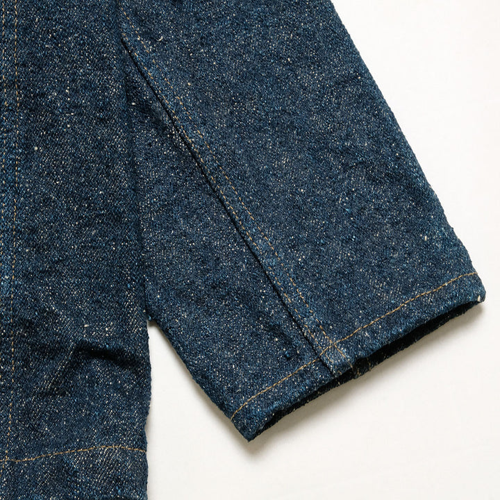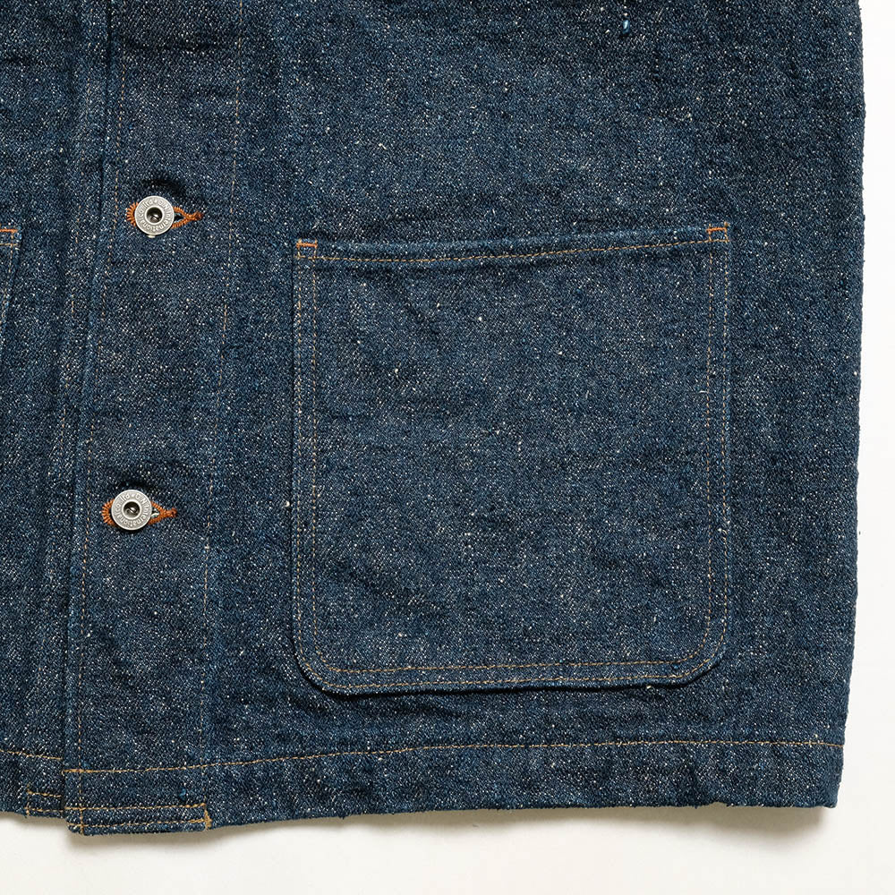 • This 20 oz. heavyweight denim follows in the footsteps of the "Asphalt Denim" introduced in the spring of 2023. The thick-count yarn twisted specially for this fabric, is woven in low tension, resulting in a hard and rough fabric with a strong nep feeling. In addition, the dyeing process for yarns is based on the first-generation "Secret Denim", using a slightly greenish dye that is reminiscent of oxidized denim. As the color fades, the beautiful blue-indigo color stands out. It is a simple coverall with one chest patch pocket, one hidden chest pocket, and sleeves sewn with triple-rolled seams like the hems of jeans instead of cuffs.