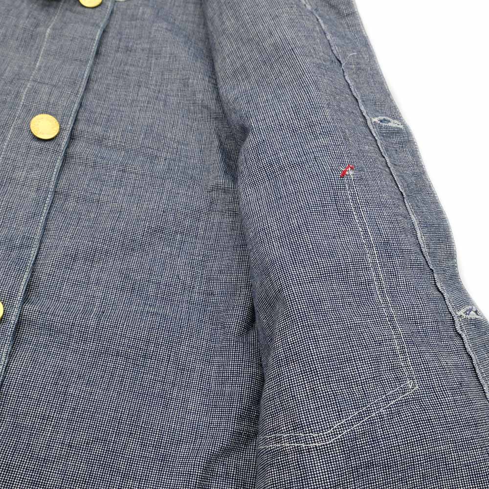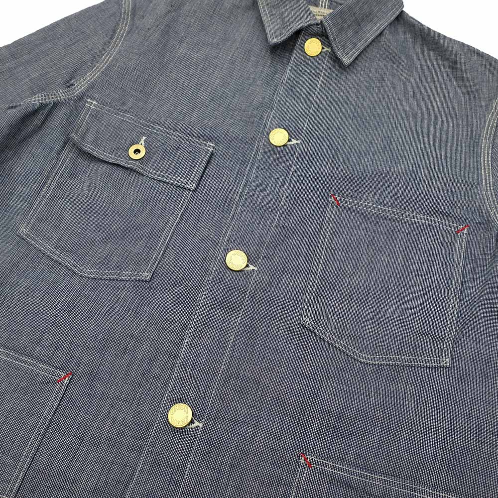 • This coverall is made of indigo and off-white pin-plaid fabric. This refreshing plaid fabric has been used since before World War II for summer-weight uniforms, such as overalls, coveralls, and jumpsuits. It seems to have been used as uniforms for occupations that were relatively less dirty than those of farmers and miners.