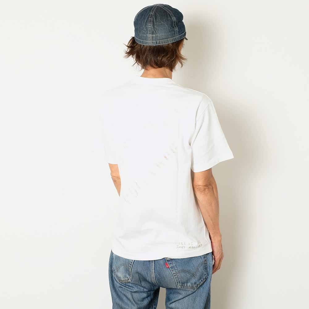 • This standard T-shirt from "WAREHOUSE" is knitted on an old-style low-gauge knitting machine, which is said to be "rarer than a loop-wheeled knitting machine. The fabric is called "shadow border" because it is woven with a 12-count uneven yarn to produce a unique shade, and even though it is a plain T-shirt, unevenness like a horizontal border appears faintly. The collar part adopts a binder neck. Instead of a modern neckline that is extremely low in the front, piping is applied to the circular rib fabric to maintain its strength, and the more it is worn, the more the neckline loosens and naturally falls.