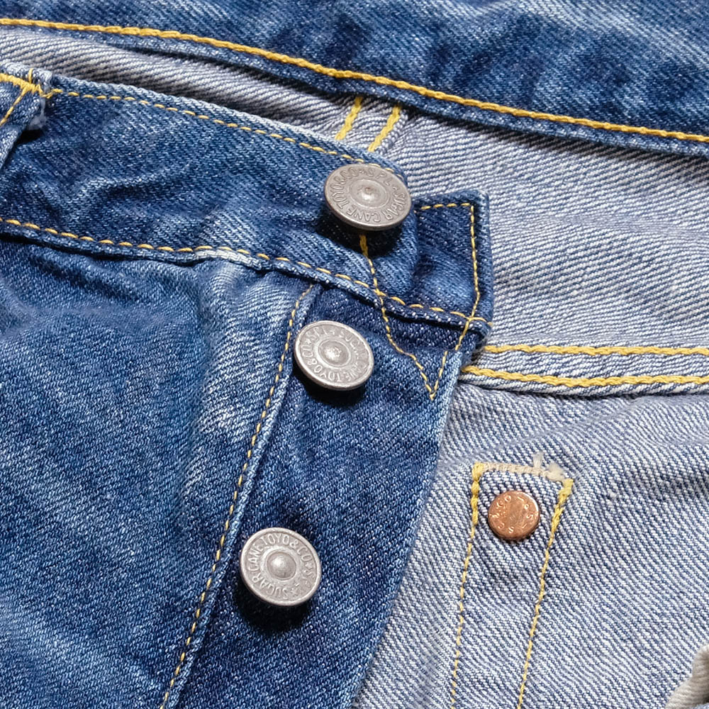 • For these distressed jeans of the 1947 MODEL, Sugar Cane has reexamined the aging technique in the past and reproduced a natural aging process. Through repeated trying, Sugar Cane has expressed the back knee whisker. The fading of the denim fabric, puckering at the seams, and the aging of the cotton thread stitching, leather patches, and metal parts are also cool.