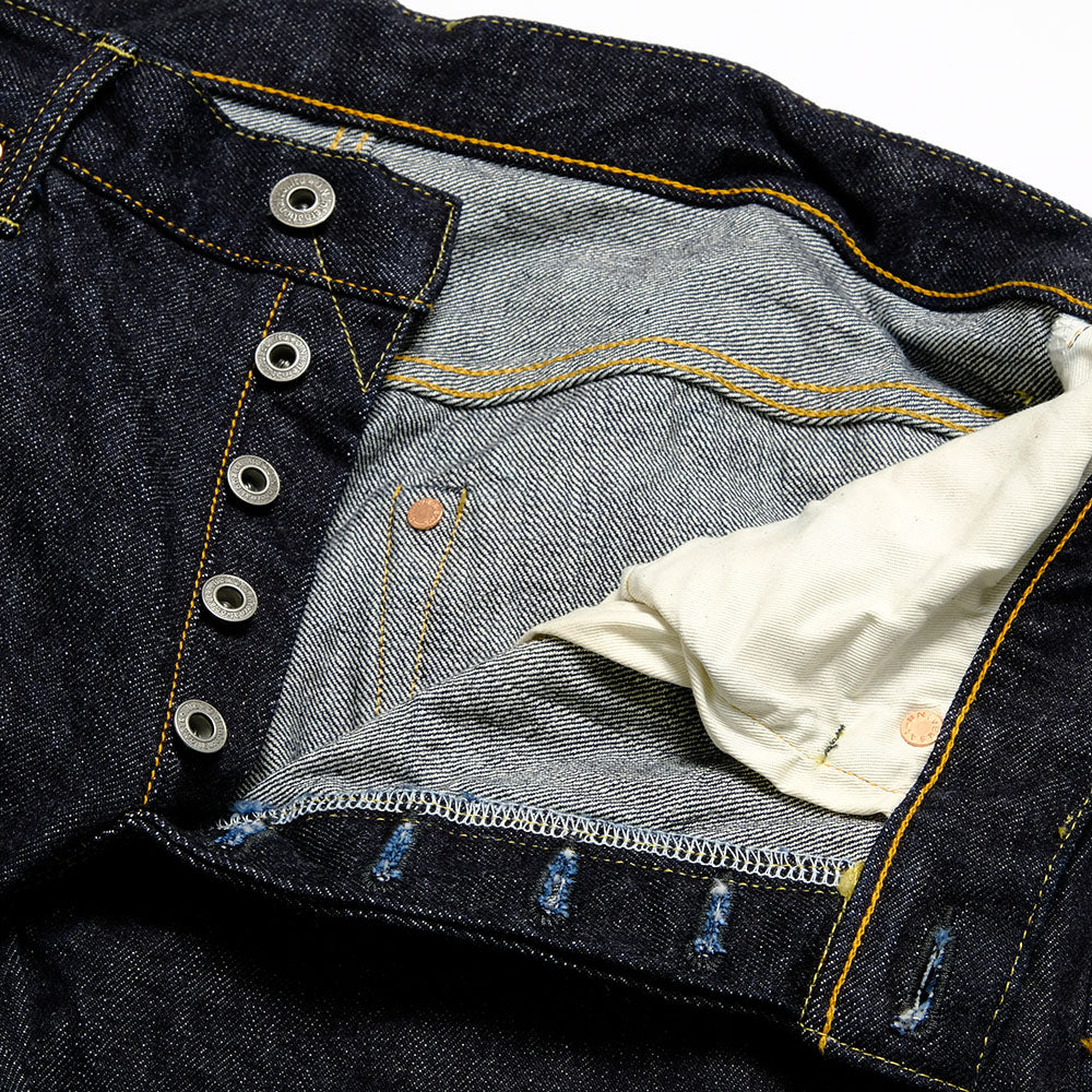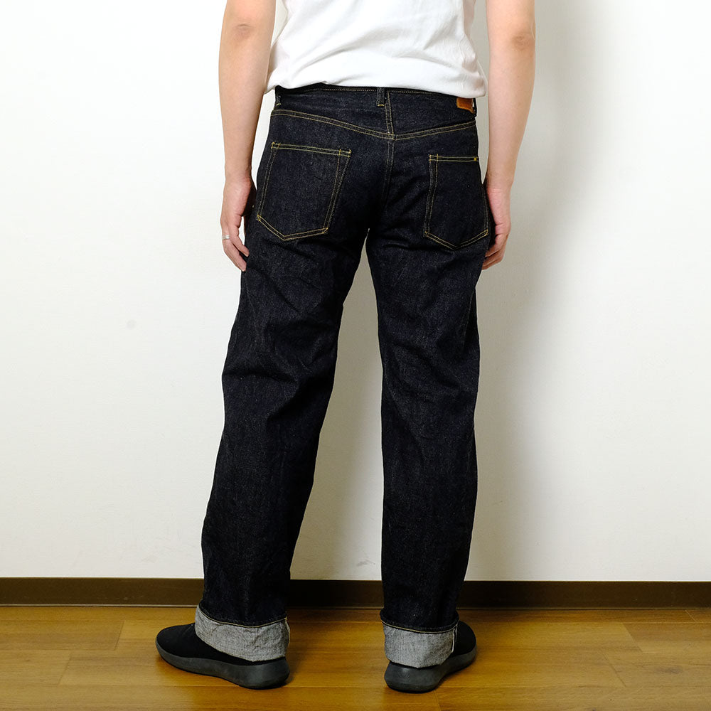• These jeans are made of low-tension woven denim, which has been a specialty of the "Oni Denim" brand since its founding. Normally, denim is woven with tensioned yarns, but this denim is woven at a slower speed with the yarns low-tensioned. This gives the fabric a rough, strong, uneven texture and leads to powerful color fading. However, the cost is not small. The power loom is subjected to a considerable burden, and the shuttle that delivers the weft yarns does not proceed smoothly with the loosened yarns, making production efficiency very poor. In addition, skilled craftsmen are required to operate the machines. These are the reasons why "Oni Denim" products are rare and special. The silhouette is wide and straight, reminiscent of the early days of workwear. The rivets hammered on the tips and the offset belt loop also add to the cool look.