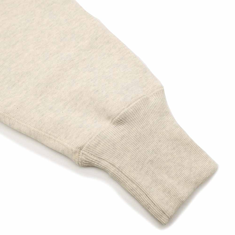 • This sweatshirt's body is a horizontal-use fabric, reproduced based on a fabric from the 1960s. This fabric, created by "WAREHOUSE" through trial and error, is characterized by its high density. The fabric, which is knitted on a vintage loop-wheeled knitting machine, is stiff but resilient, heavy but soft and fluffy.