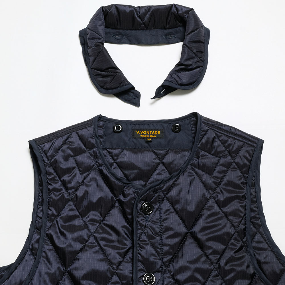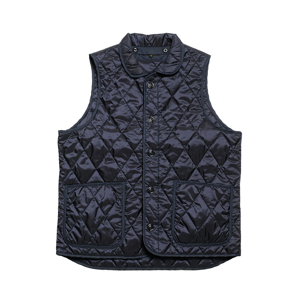 • This quilted liner vest design is inspired by the liner of a US military parka. The material used is 100% nylon military micro-rip. The insulation is laminated with “QUOISM”, a high-tech insulation material with antibacterial, deodorant, and heat-storing functions, in a diamond-shaped quilted pattern. Piping is applied to all areas, including pockets and sleeves, and the collar is detachable to allow for a wide range of outfits. Lightweight and thin, with high warmth retention, it can be worn by itself, or as an inner layer without feeling bulky, making it an easy-to-use vest for layered styles.