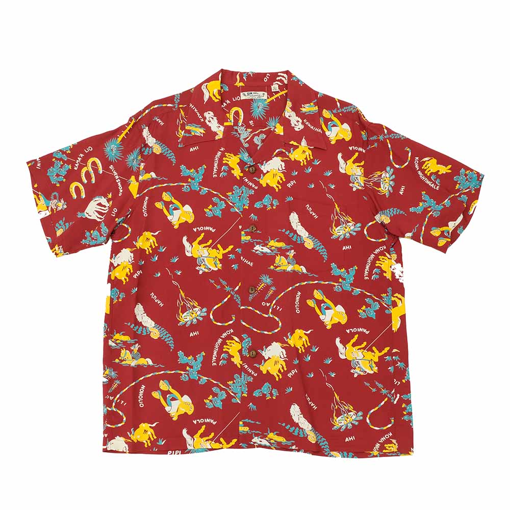 • This Aloha shirt is reproduced by "Sun Surf" based on vintage shirts. “PANIOLA” is a Hawaiian cowboy who garners much respect among cowboys throughout the United States. With its origins in Mexico, they carry on the ancient traditions and high skills of the cowboys to the present day. In the design, the scene of cattle arriving at the port of Kawaihae and being brought ashore by swimming in the ocean, PANINI (wild Hirauchiwa Cactus), PIPI (cow), and LIO (horse), motifs essential to cowboys, are also depicted with a comical touch. It is a very rare patterned Aloha shirt that also depicts a cowgirl dancing the hula to the accompaniment of a guitar.