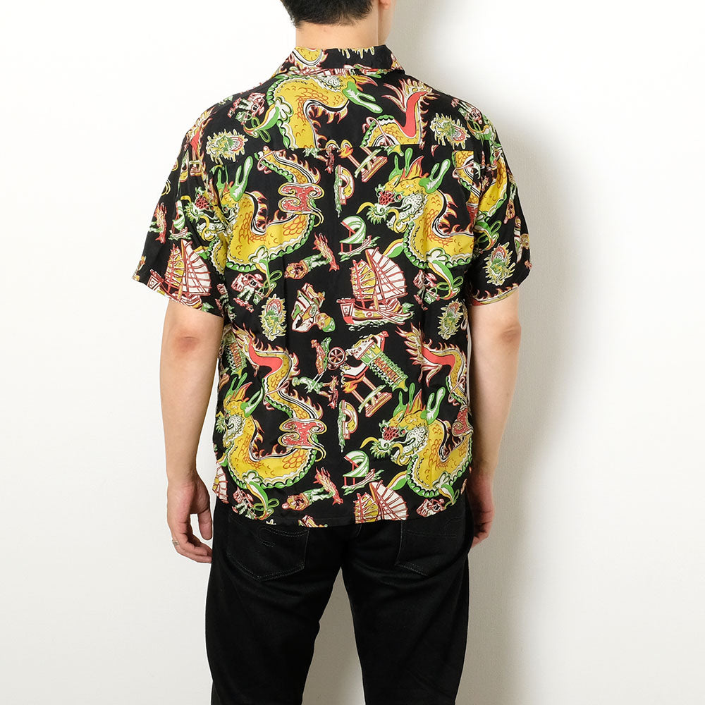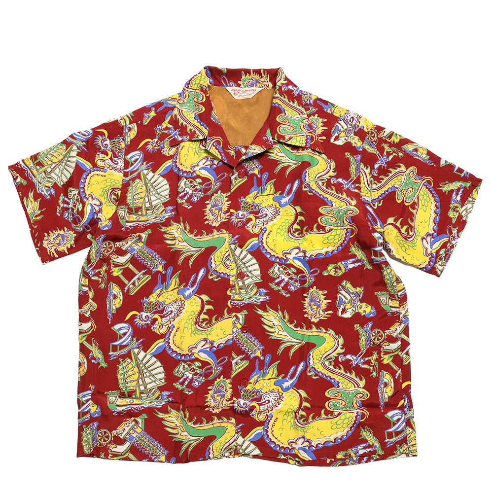 • This Aloha shirt with the vintage label (HAUOLI KAMAAINA) is reproduced by "Sun Surf". The legend of the dragon is said to have originated in China and began with a serpent living by the water. This work depicts a dragon motif with a unique touch. Chinese immigrants had long been engaged in labor in Hawaii. Like the Japanese immigrants, they reconstructed their own culture and customs in Hawaii and established them as a new culture. In Honolulu's Chinatown, Chinese-style buildings from that time still remain, and there are several stores selling food and other products imported from China, showing the great influence they had on Hawaii's culture.