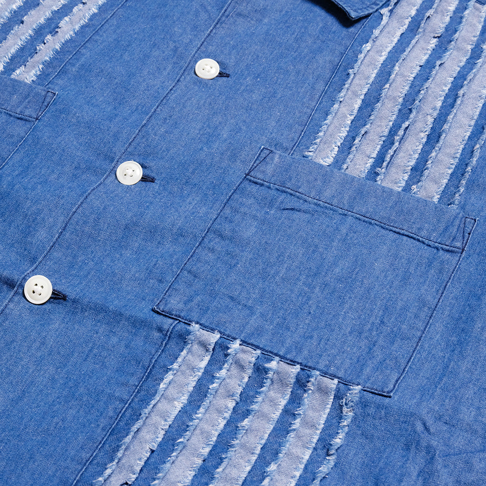 • The shape is a basic short-sleeved shirt with two pockets, but the frills on the front are distinctive, giving it a presence even as a single piece. It has a Cuban shirt-like appearance, making it a shirt that matches the hot season. The material is a thin denim woven from carefully selected Indian cotton. It is light and soft to the touch.