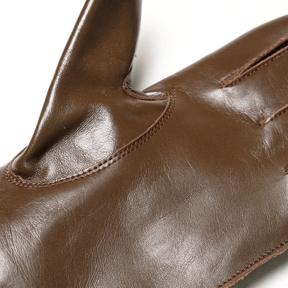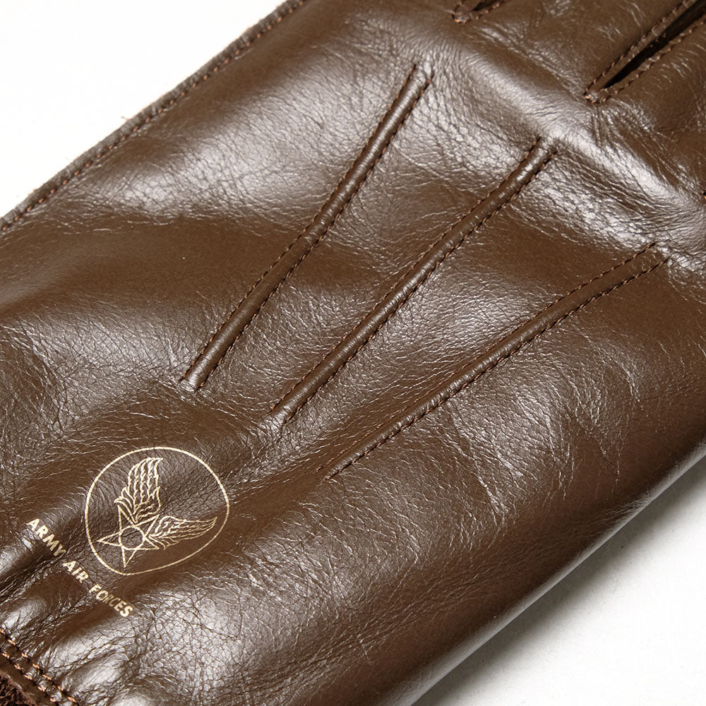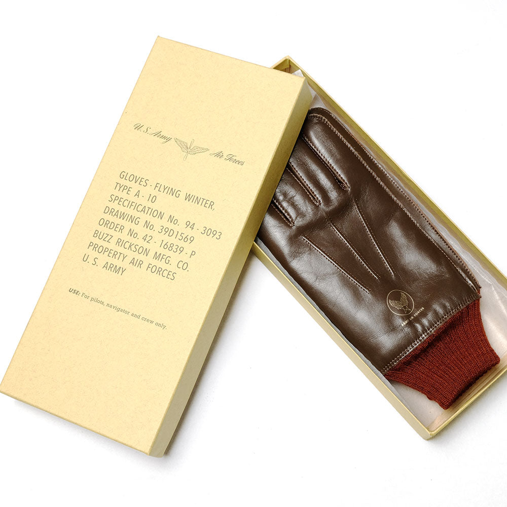 • These Type A-10 Gloves are reproduced by "Buzz Rickson's" based on the vintage. The U.S. Army Air Forces adopted the Type A-10 gloves for pilots' winter use in 1938. The primary leather was specified as goatskin or pony hide, with 100% wool knit lining for comfort. The wrist featured tubeknit wool, reinforced with a leather patch to prevent stretching during wear. The three stitches on the back of the hand reduced leather stretching, maintaining a snug fit. The detailed construction, including the palm and back sewing around all five fingers, required high-level sewing skills, reflecting the gloves' meticulous craftsmanship.