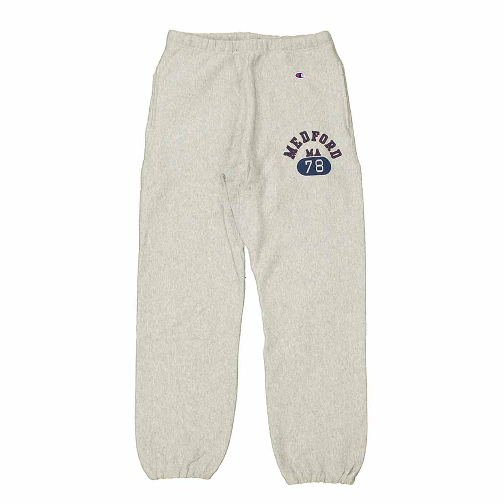 • These sweatpants from the "REVERSE WEAVE 11.5oz. Terry Fleece" series are made of fabric with brushed lining, using the "REVERSE WEAVE" manufacturing method, which is synonymous with "THE KING OF SWEATSHIRTS" of "Champion". "Reverse Weave" is that the fabric originally used in the vertical direction is used in the horizontal direction to prevent vertical fabric shrinkage, and at the same time, the gusseted rib at the inseam allows for ease of movement. Seamless design from the side pockets down reduces stress when putting on and off. Elasticized waist and hem, with relaxed silhouette at the knees and hem. The college-style print typical of "Champion" is very cool. The name tag uses the commonly known "blue single-color tag" which was used in 1970s products.