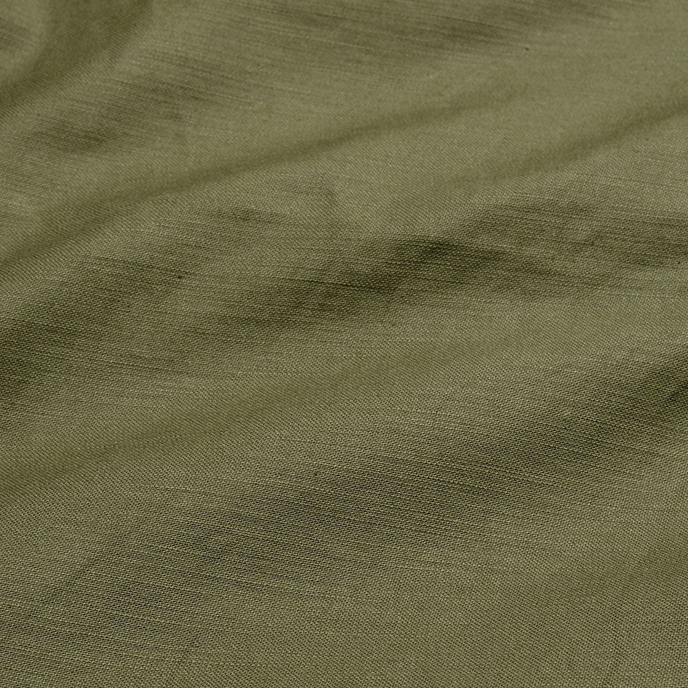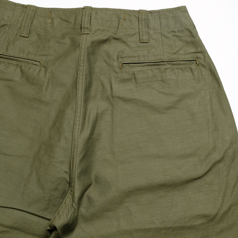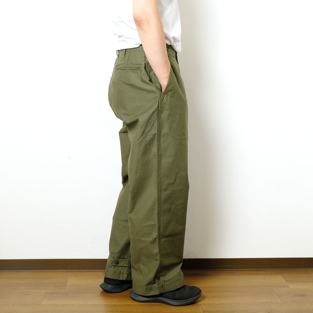 • These Type M-1943 trousers are reproduced by "Buzz Rickson's", based on vintage trousers. With the introduction of the M-43 Field Jacket, which was developed by the Army to meet the needs of all environments, the Army adopted the trousers to be worn as a matching the matching clothing. The material used for the original M-43 trousers is back sateen, with the reverse side of thick cotton sateen fabric used for the front, the same as the field jacket. It features size-adjustable tabs around the waist, belt loops, and buttons for suspenders, and elaborate specifications that allow the wearer to choose how to wear it. The hem has tabs, and when buttoned up, it becomes a jodhpur style to keep the outside air, dirt, and dust out.