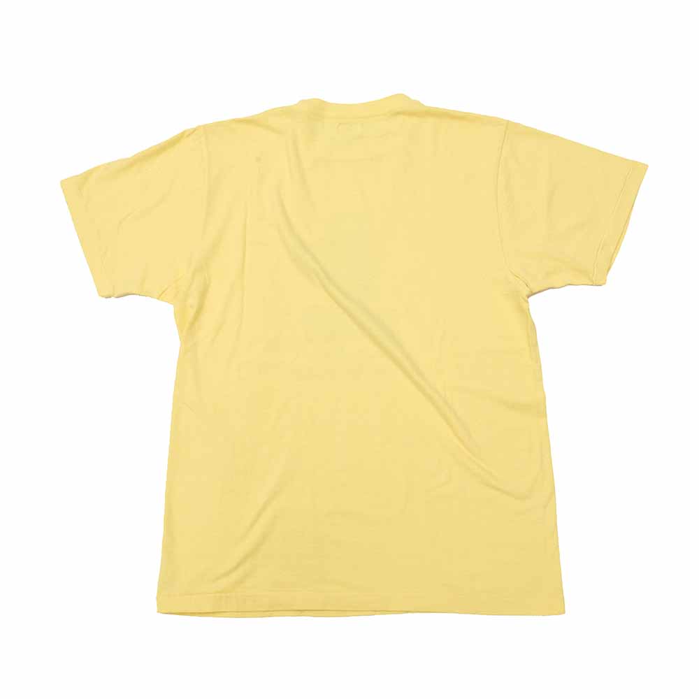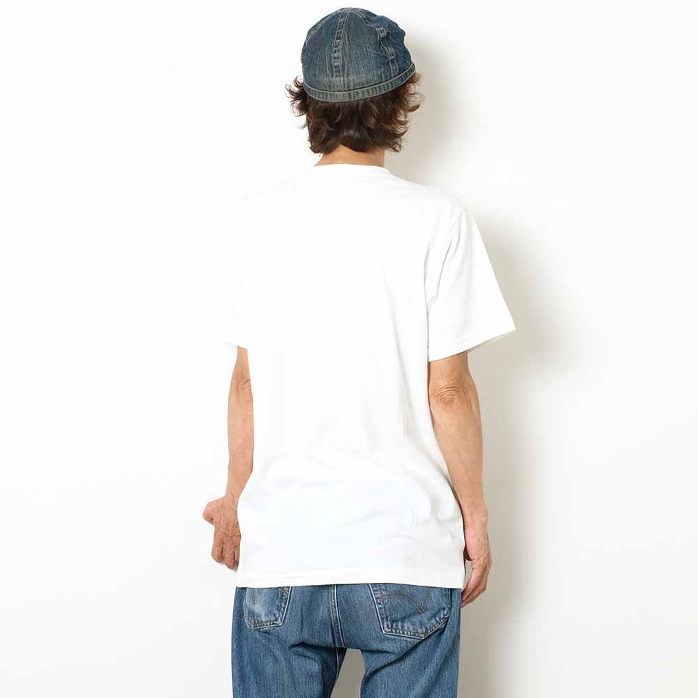 • This T-shirt combines a good old-fashioned USA design with a superb texture reminiscent of the bodies of that era. The fabric is a T-cloth made of a recycled cotton blend. Recycled cotton is yarn made by collecting and cutting cotton scraps and fallen wadding that had been discarded at spinning and sewing factories. Not only is it environmentally friendly, but recycled cotton is also characterized by its unique soft texture, unevenness, and coloring. It is a loop-wheeled T-shirt with a dead-stock-like texture by using an old-fashioned knitting machine and sewing machine. The neck and shoulders are covered with tape for a comfortable fit. Many customers are fans of this item not only because of the design but also because of the texture and comfort of the fabric.