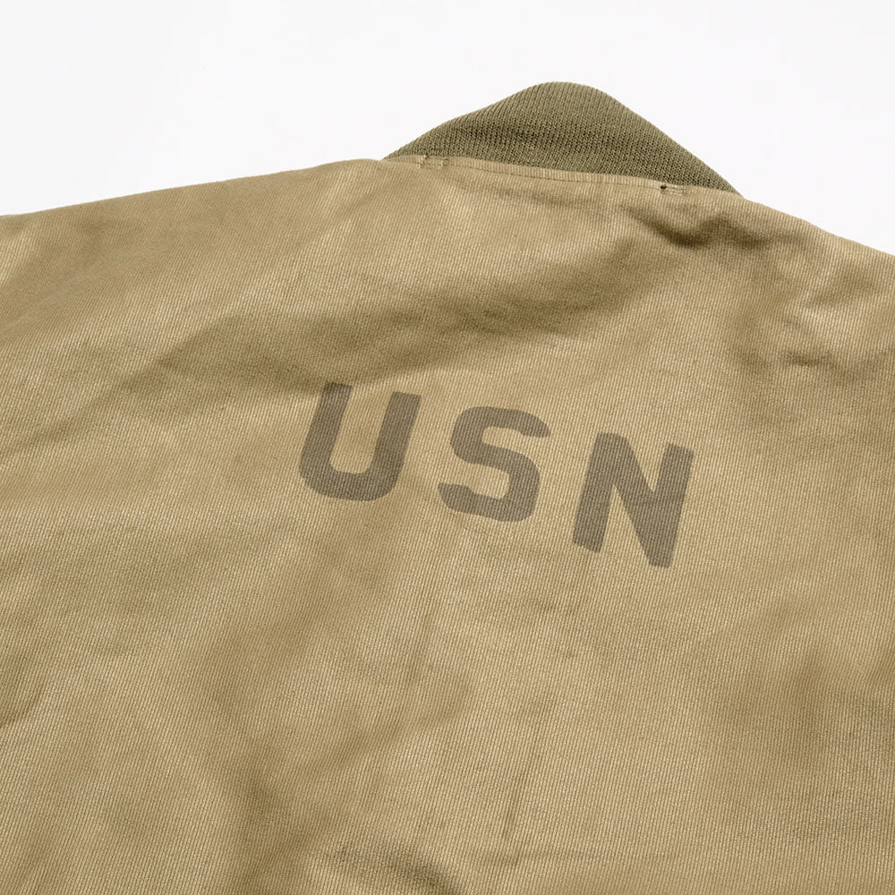 • "WAREHOUSE" has reproduced the "36J1," a prototype of the cotton flight jacket "37J1" used by the U.S. Navy. This model features a neck rib reminiscent of the A-1, jungle cloth used as a substitute for leather, and a front zipper with eyelets reminiscent of the era when zippers were replaced by buttons. The lining is made of sulfide-dyed weather cloth. The stencil on the back is also an exact reproduction of the originals.