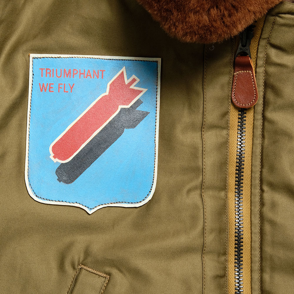 • This Type B-15 with patches is reproduced by "Buzz Rickson's", based on vintage jackets. The 534th Bombardment Squadron under the 8th Air Force was established in Gowenfield, Idaho in November 1942 as one of four squadrons of the 381st Bombardment Battalion. Shortly after its inception, the squadron moved to Pyote A.A. Base, Texas, and began flight training in B-17 Flying Fortresses. On the European front, the squadron was heavily intercepted by the enemy, but accurately attacked shipyards, oil refineries, and aircraft factories, for which it was awarded the Outstanding Unit Award. Each patch on the jacket is elaborately hand-painted on leather, and the 381st Bombardment Battalion's motto, “TRIUMPHANT WE FLY”, raised the men's morale.