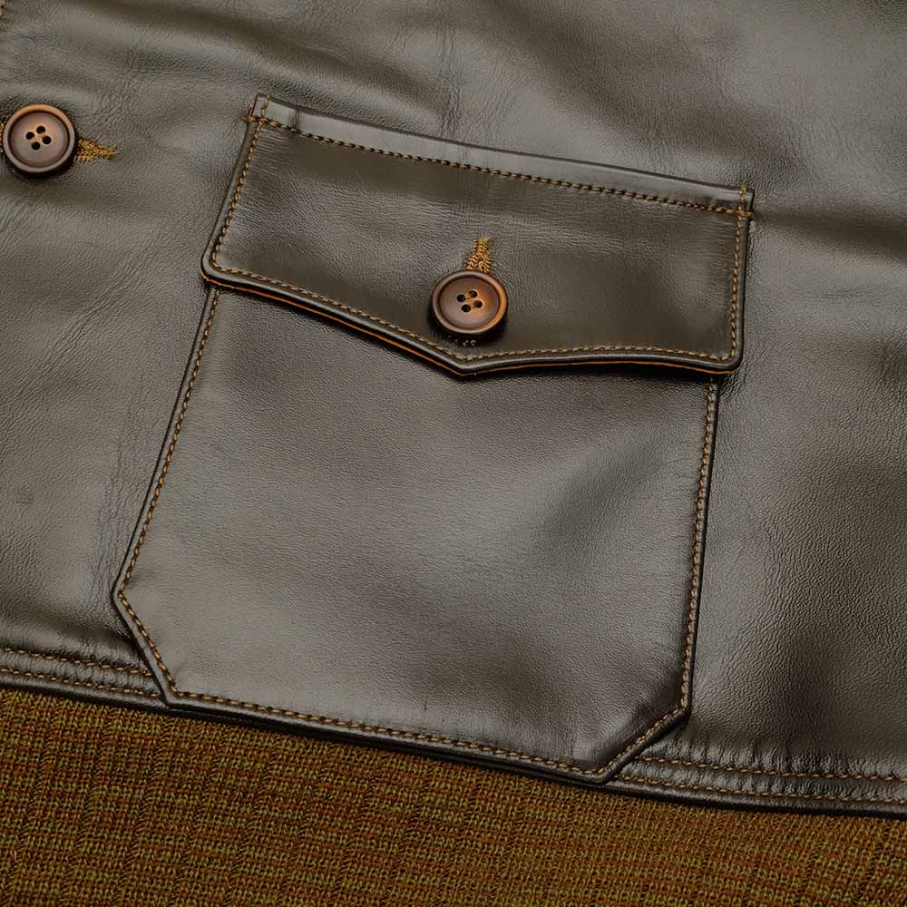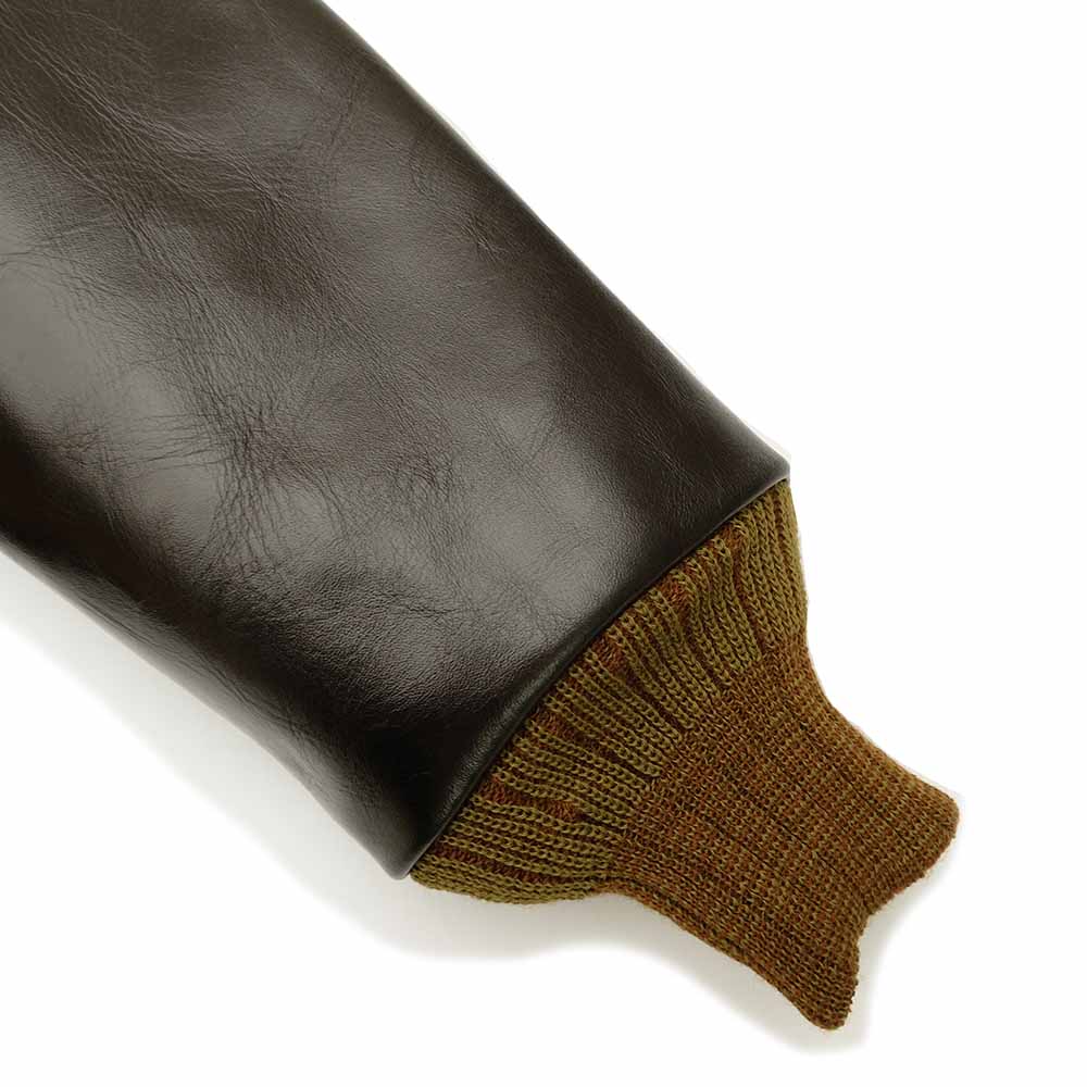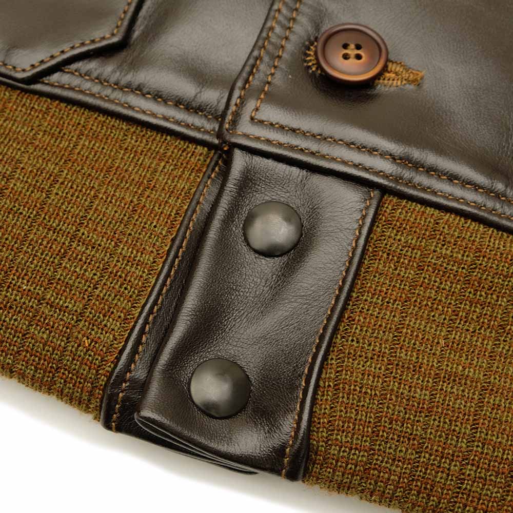 • This Type A-1 leather jacket is reproduced by "Buzz Rickson's", based on vintage. The Type A-1, established in 1927, was produced as a summer flight jacket until the adoption of the A-2 in 1931. Before zippers became practical, the front used buttons for closure. The A-1 used sheepskin, which, while flexible and easy to move in, was less durable compared to horsehide or steerhide, making surviving examples rare and miraculous finds. This A-1 uses a horsehide for enhanced durability. This season's horsehide underwent full vegetable tanning, with a finish using pigment coating for better water resistance. Initially projecting a subdued, sophisticated appearance, the jacket transforms into a rugged, aggressive look as the surface coating wears off with extended wear.