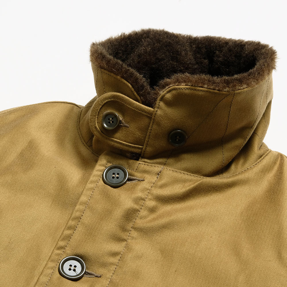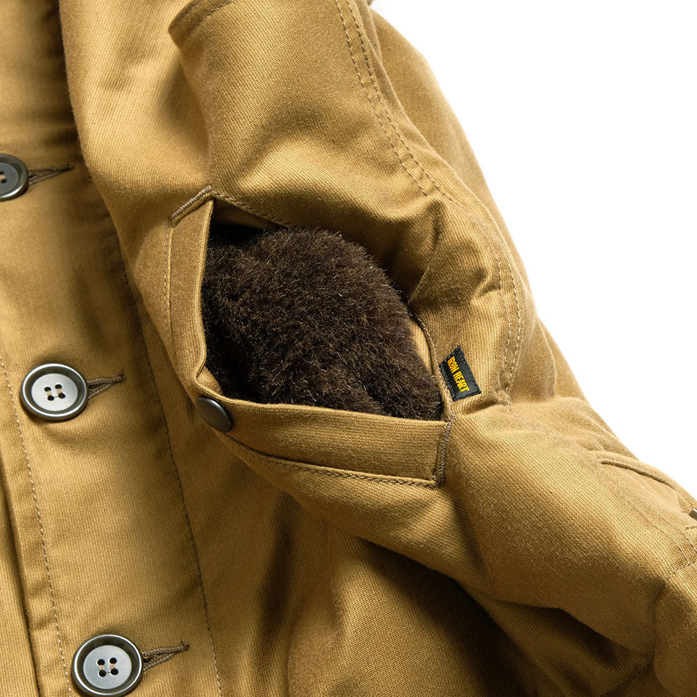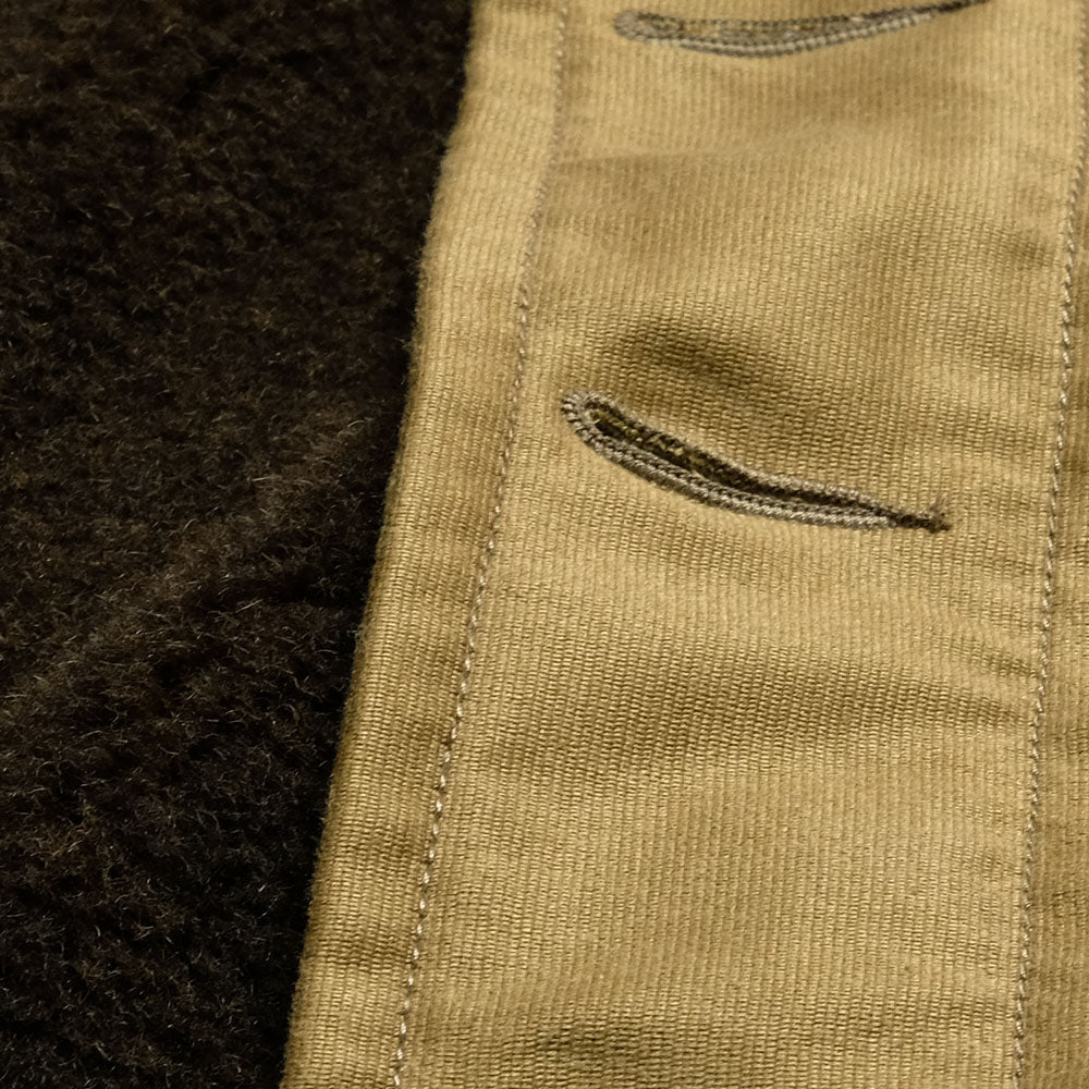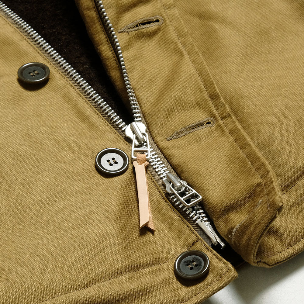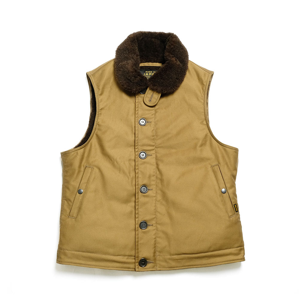• This "N-1 TYPE DECK VEST" from IRON HEART is made of jungle cloth densely woven for windproofness for the outer fabric and an alpaca wool boa for the lining to keep warmth. The front has a double-layered structure, double zipper, and button closure to prevent wind from entering. Alpaca wool is used for the pockets at the waist as hand warmers.