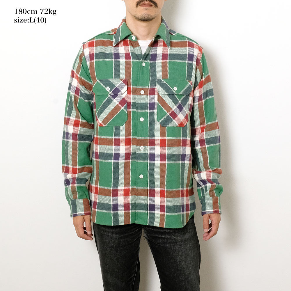 • "JOHN GLUCKOW" is a brand developed by Mr. John Gluckow, a world-class vintage dealer based on the East Coast of the United States, and WAREHOUSE as a partner. This flannel fabric is woven on an old-fashioned power loom, which remains only in a very limited area in Japan. By carefully weaving uneven yarns at low speed, the original unevenness and texture of the yarns are not lost. The beautifully deep coloring of this flannel shirt would age and change over time to be a more subdued look.