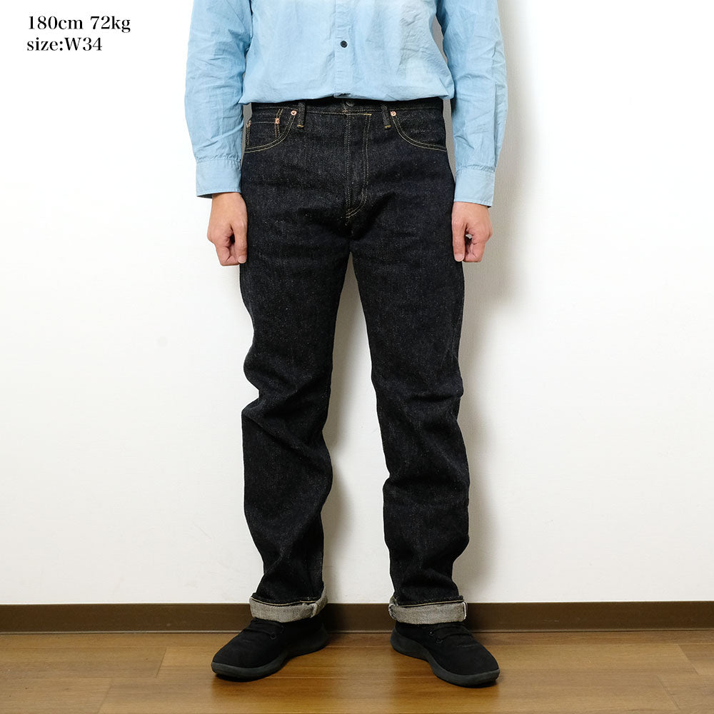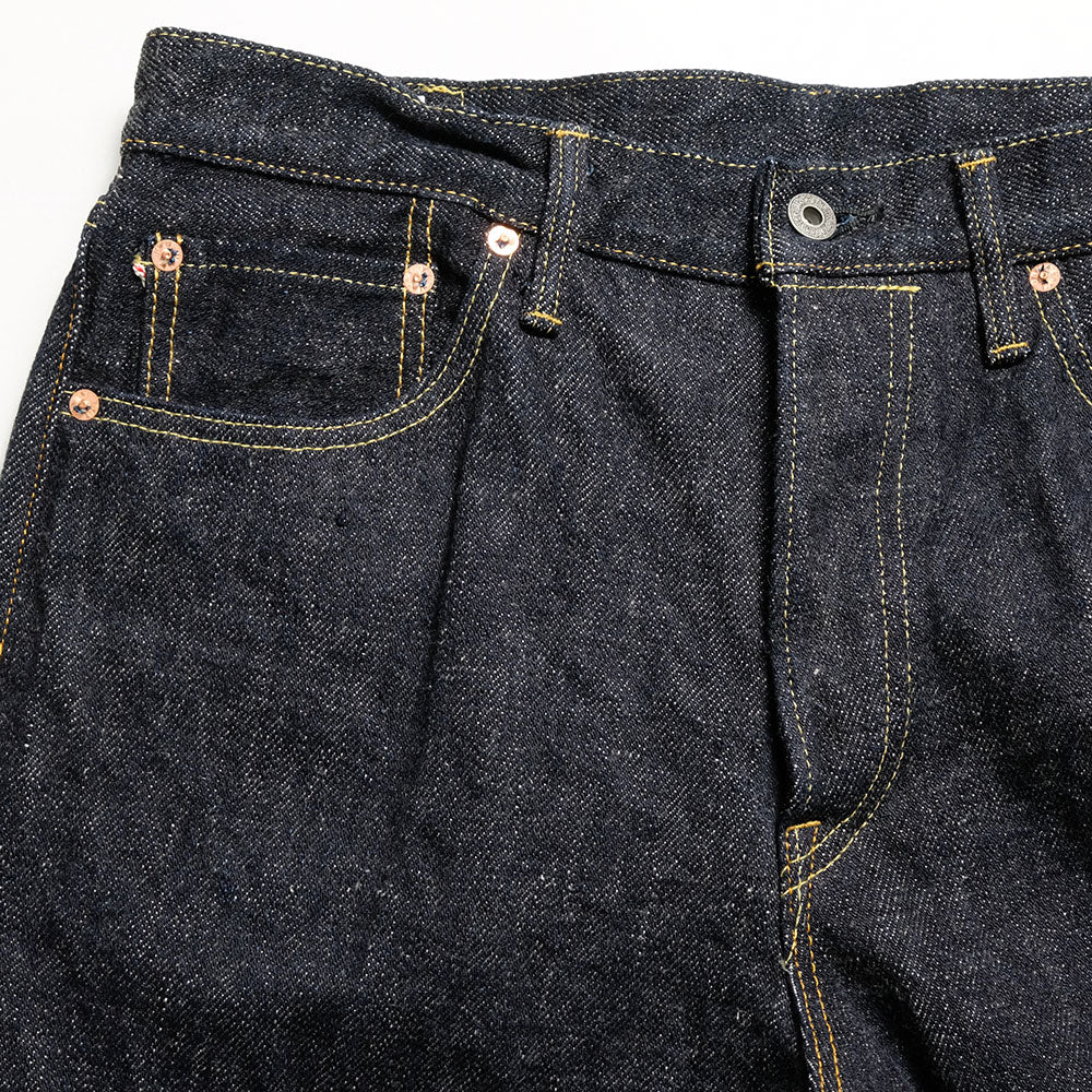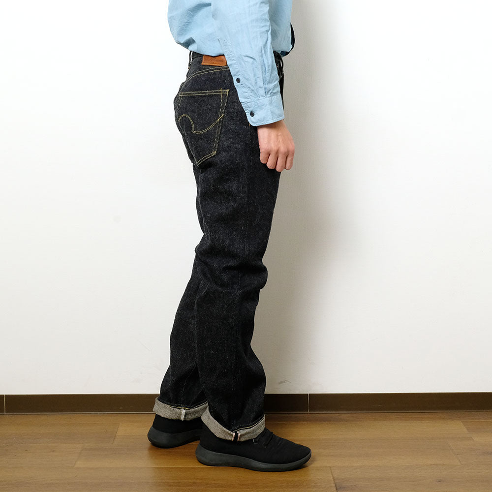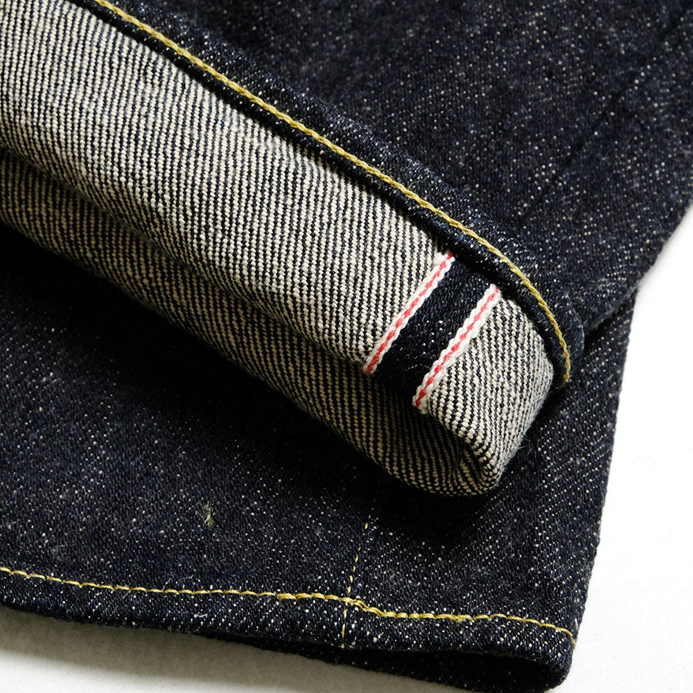 • The extra-dark indigo version of the 20oz. denim, a fabric representative of Oni Denim. Despite being a thick 20oz. fabric, it has a very supple texture. Also, by mixing several types of yarns of different thicknesses, it has a characteristic rough texture. Traditionally, it has a green cast of indigo, but this time, an extra-dark indigo is used, giving it a deep color. The weft yarn is a light beige yarn, which makes the indigo color stand out even more. The silhouette is a regular straight cut. Its straight silhouette evokes the good old days, creating a rugged, masculine look.
