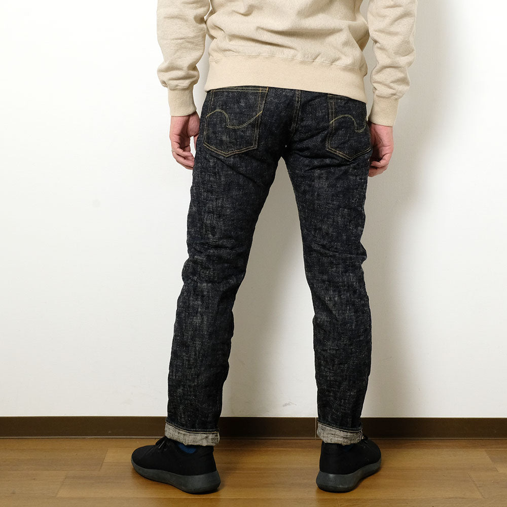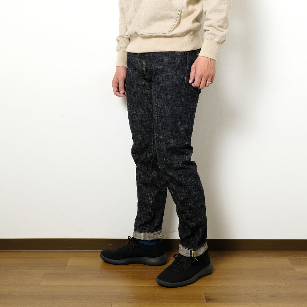 • The unique denim fabrics are completed when the cotton quality, the spinning machine to spin the yarn, the power loom to weave the yarn, and the craftsman's skill to manipulate them are all in place. "Oni Denim" used to have a fabric called "Kihan-nen," but it is no longer produced. However, "Oni Denim" has created a new fabric with the intention of surpassing the "Kihan-nen" fabric of that time. This new fabric is woven with unevenly thick ultra-slub yarns in low tension. The weft yarns appear floating in spots, reminiscent of Japanese kasuri fabrics. The name "Oni-Kasuri" comes from its appearance. The wavy texture of the fabric is the essence of "Oni Denim". You can recognize it as “Oni Denim” at a glance. The silhouette is a relaxed-tapered. The high rise, strong taper toward the hem, and sophisticated design highlight the ruggedness of the fabric.