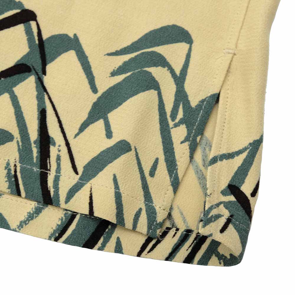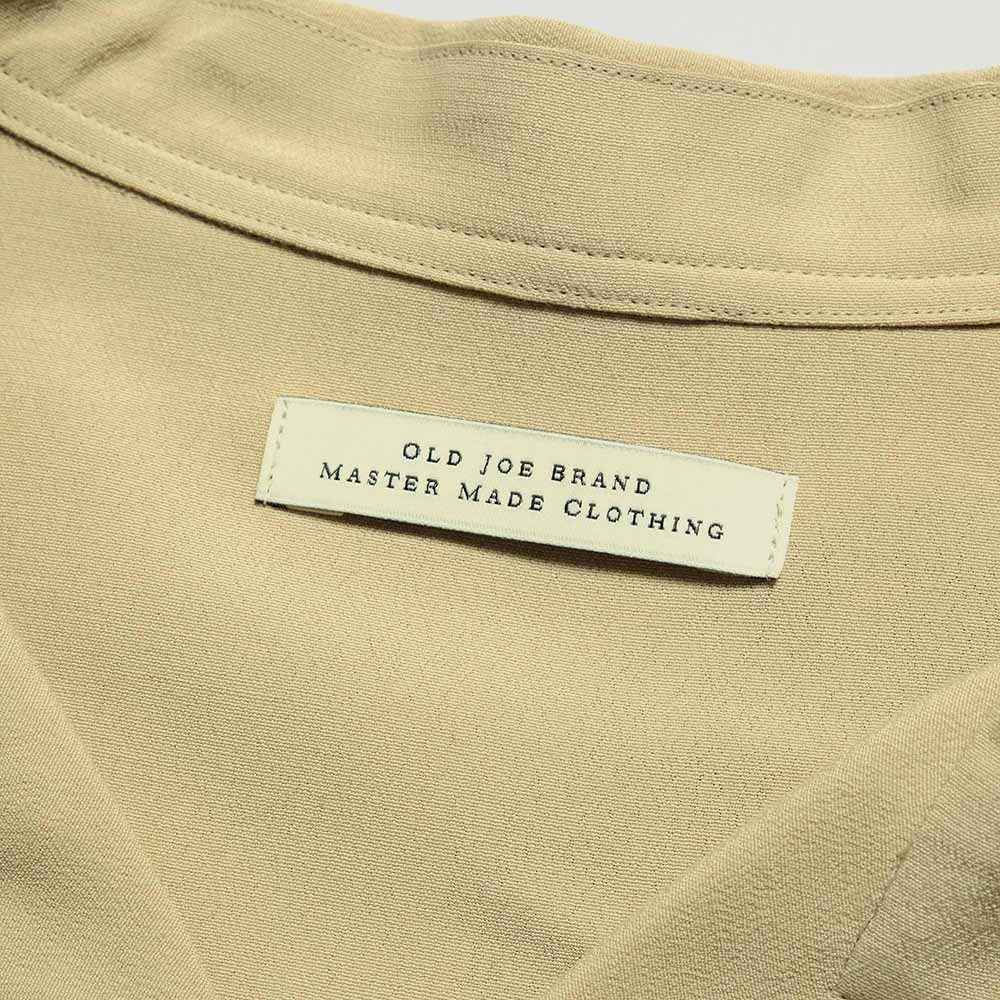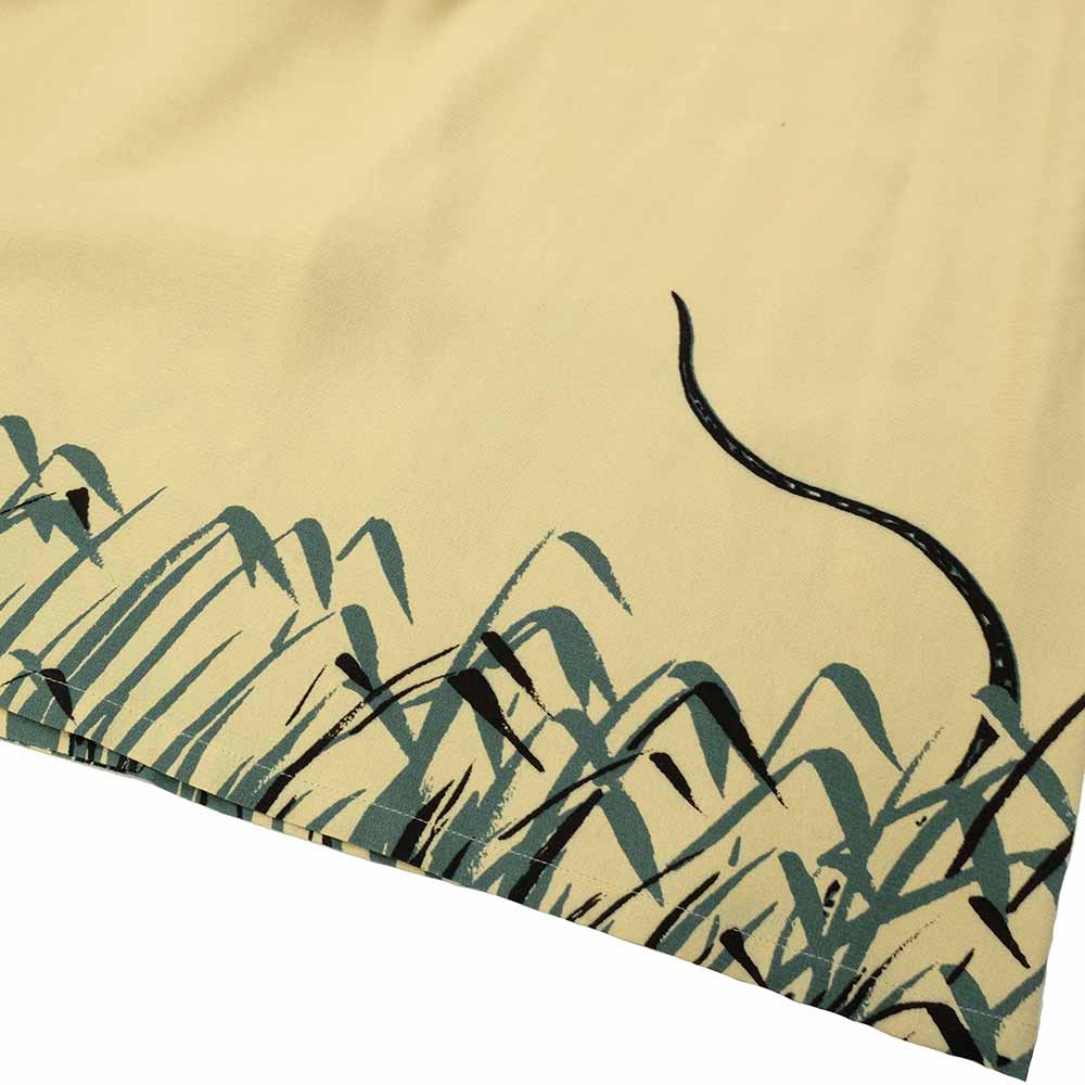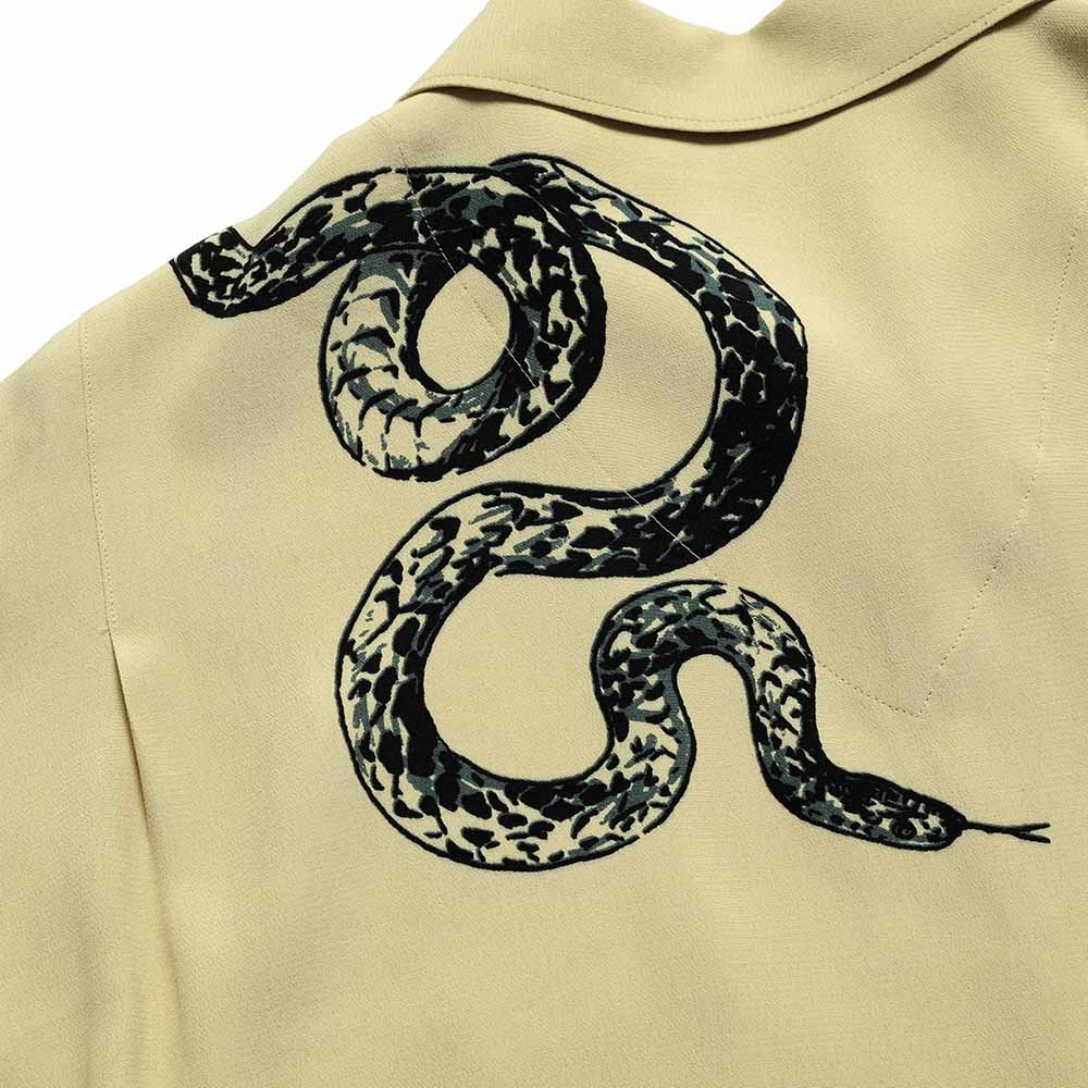 The Original Textile One-Up Collar Shirt from "OLD JOE BRAND". Featuring a long top loop, a back yoke-less detail, and curved collar tips, this very classic and elegant shirt is inspired by archive pieces from the 1940s-50s. The unique, hand-drawn snake motif by "NUTS ART WORKS" creates an exceptional presence unlike any other. Woven from short-fiber spun rayon, it achieves a natural sheen reminiscent of natural fibers, giving it a smooth texture, and an uneven texture typical of crepe material creates an elegant finish.