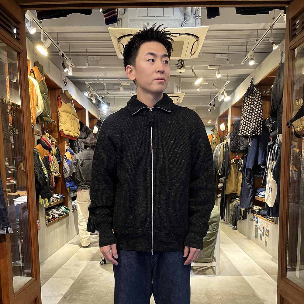 This tweed zip sweater with a centripetal knit is the signature item of the "Old Joe". Featuring a modern fit with generous width, the calf leather elbow patches are hand-patina processed this season, allowing you to enjoy the look of aging. The main material blends straight wool with linen-kempi yarn. Within the high-quality knit fabric, the Kempi yarn with a rough texture asserts itself, creating a surface with great depth. The linen-blended Kempi yarn, plated with straight wool yarn, is knitted to a 7-gauge with the reverse side of a half cardigan stitch. The plating technique creates a more three-dimensional structure when knitting with a half cardigan stitch. The stiff linen effect contributes to a lightweight feel while also providing a knit structure that resists losing its shape.