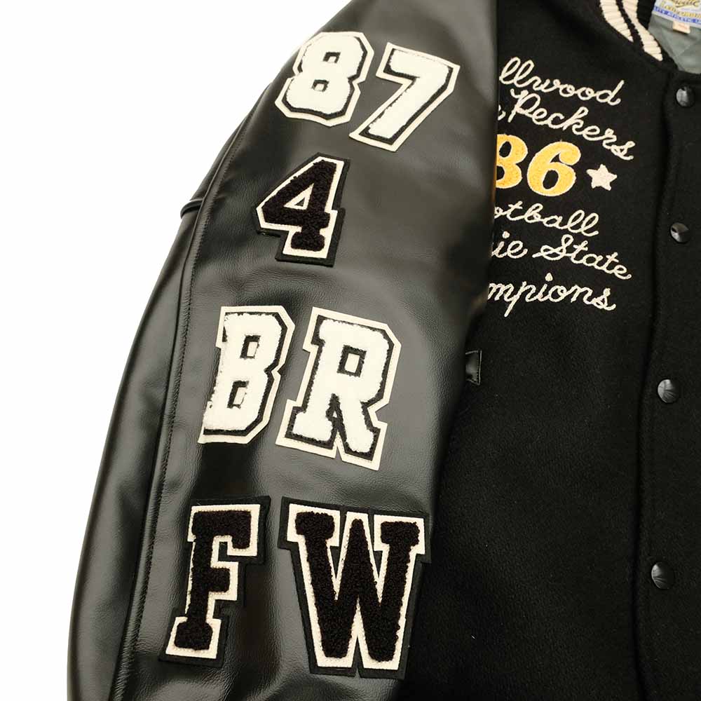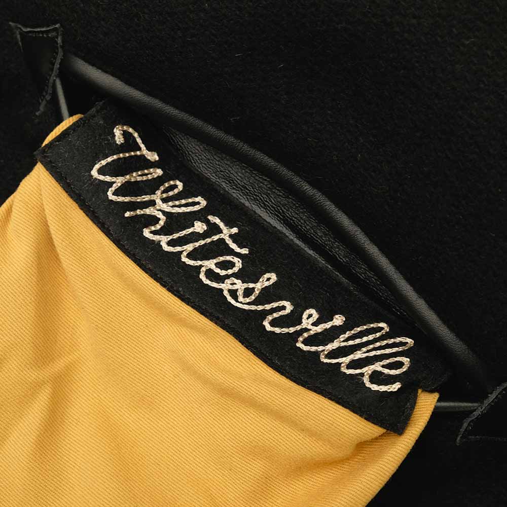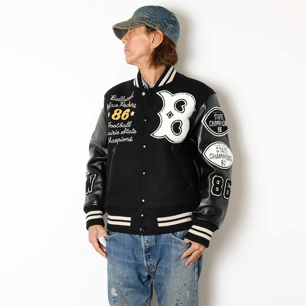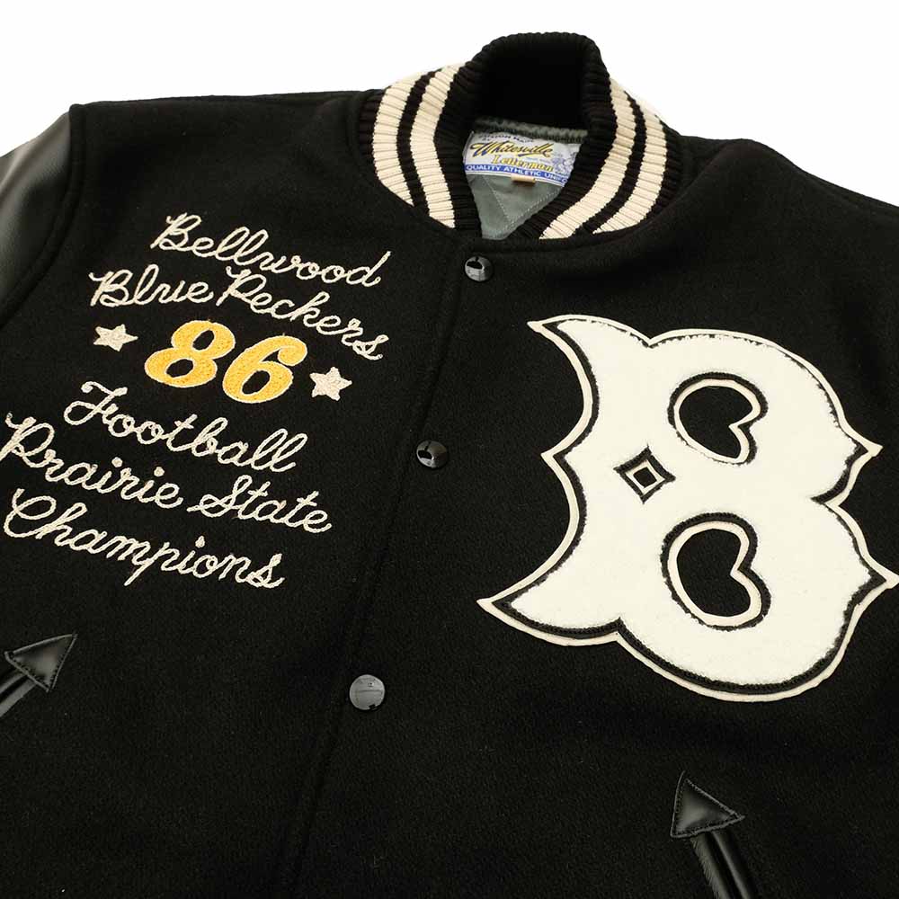• "WHITESVILLE" has reproduced this award jacket based on the vintage jacket of the football team, BLUE PECKERS. "Prairie State" embroidered on the right chest is the nickname for Illinois, where they are based. This luxurious jacket is decorated throughout with commemorative chenille and embroidery celebrating their state championship victories in 1986 and 1987. The orange embroidery on the back stands out beautifully against the dark-colored body.
