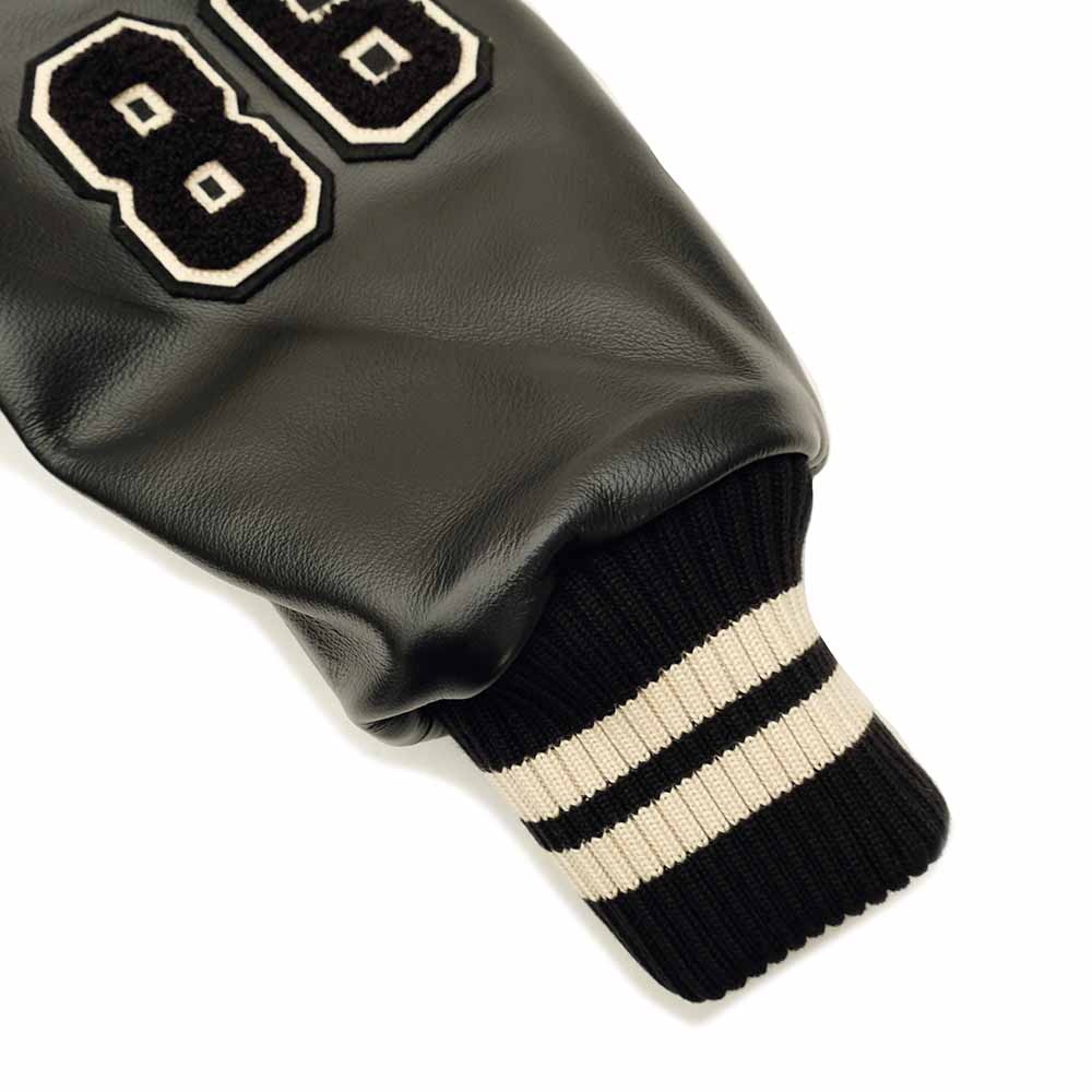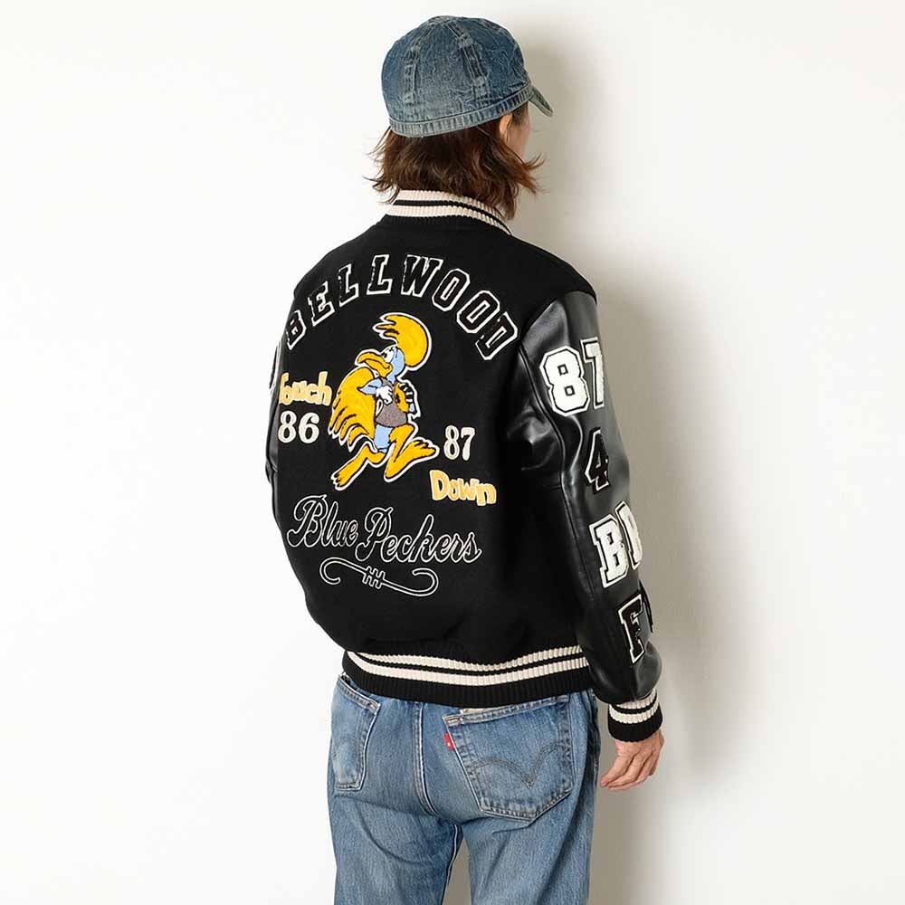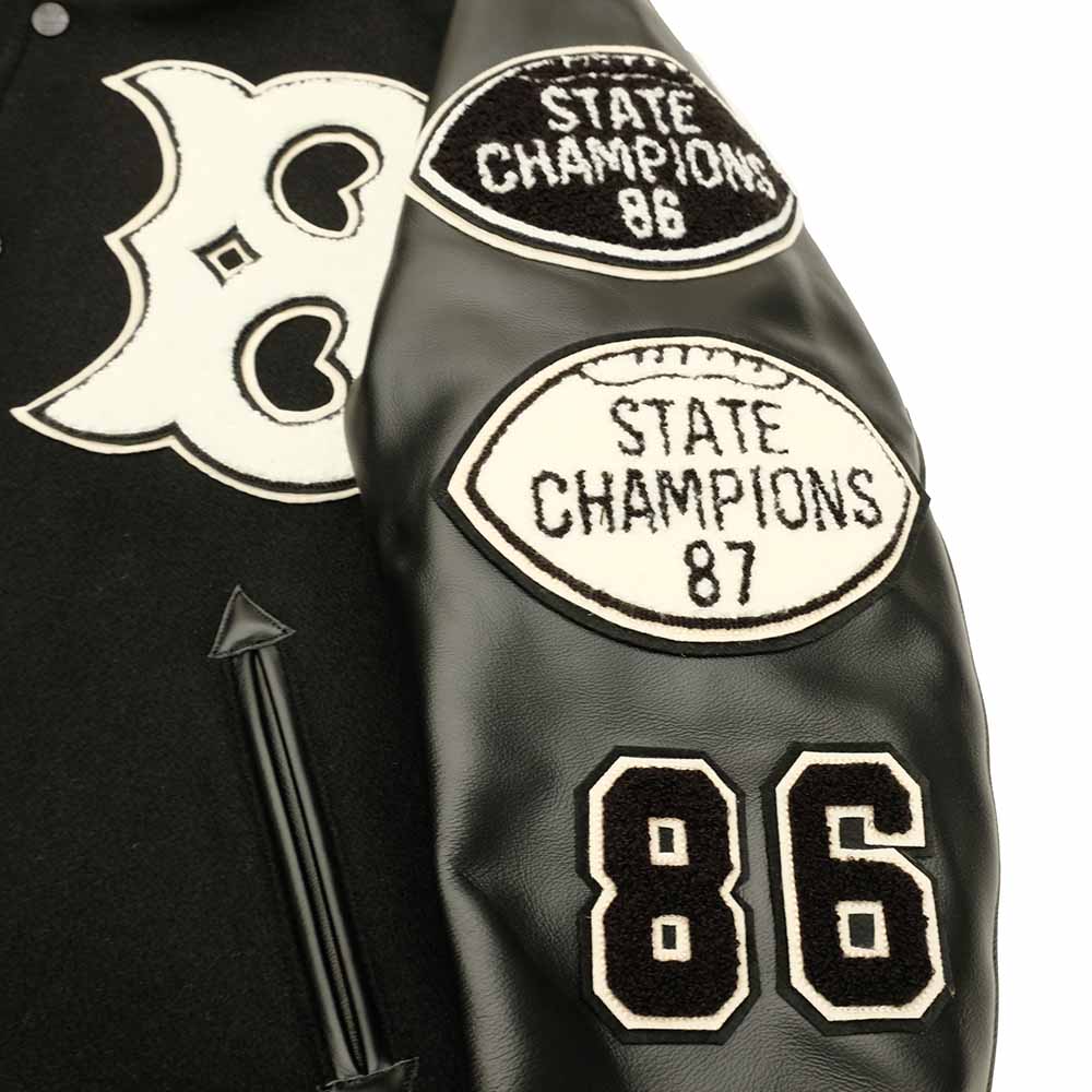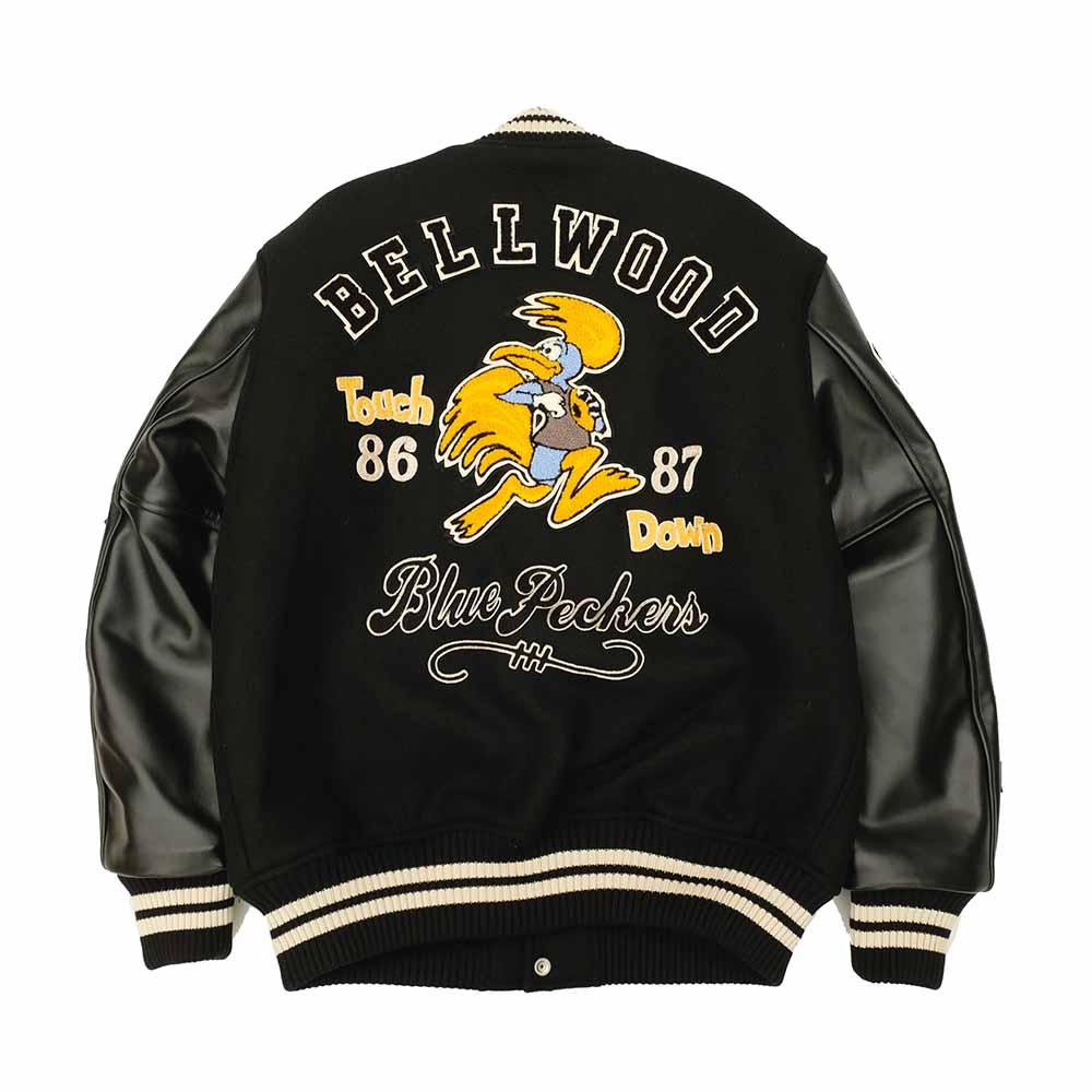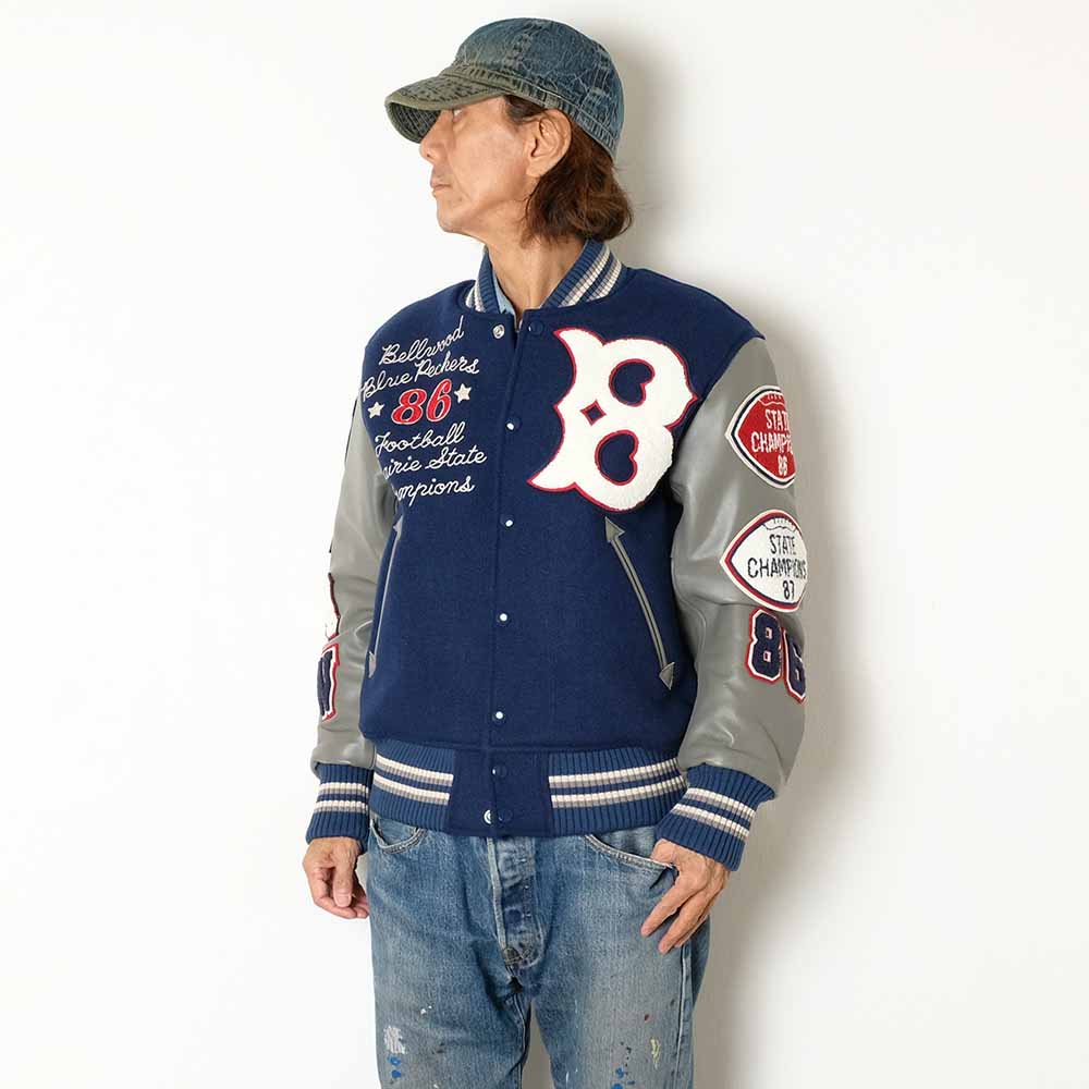 • "WHITESVILLE" has reproduced this award jacket based on the vintage jacket of the football team, BLUE PECKERS. "Prairie State" embroidered on the right chest is the nickname for Illinois, where they are based. This luxurious jacket is decorated throughout with commemorative chenille and embroidery celebrating their state championship victories in 1986 and 1987. The orange embroidery on the back stands out beautifully against the dark-colored body.
