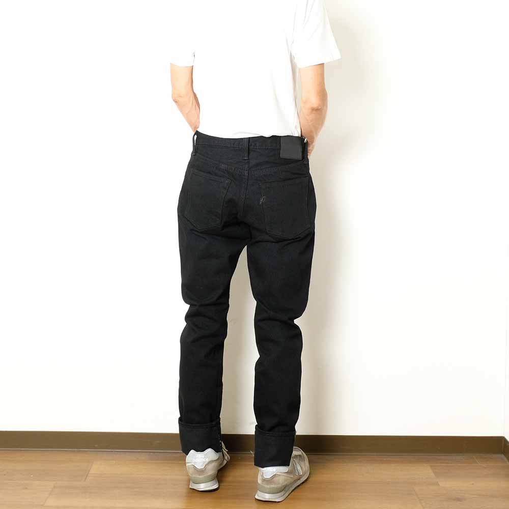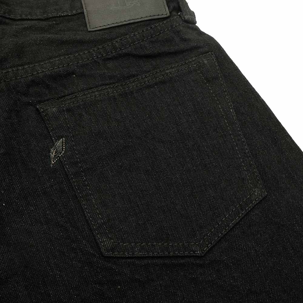 • This model expresses the unique texture of Pure Blue Japan's signature denim in all black. Both the warp and weft threads are black, and the jeans are meticulously crafted from the weave to the details. The buttons, leather patch, and leaf on the right back pocket are all black, giving the jeans a minimalist yet heavy look. As you wear the jeans, the black gradually fades to gray, creating a deep monochrome contrast. The relaxed-tapered design offers moderate roominess around the hips and thighs while tapering sharply toward the hem. The refined silhouette and cool black color add sharpness to your outfits.