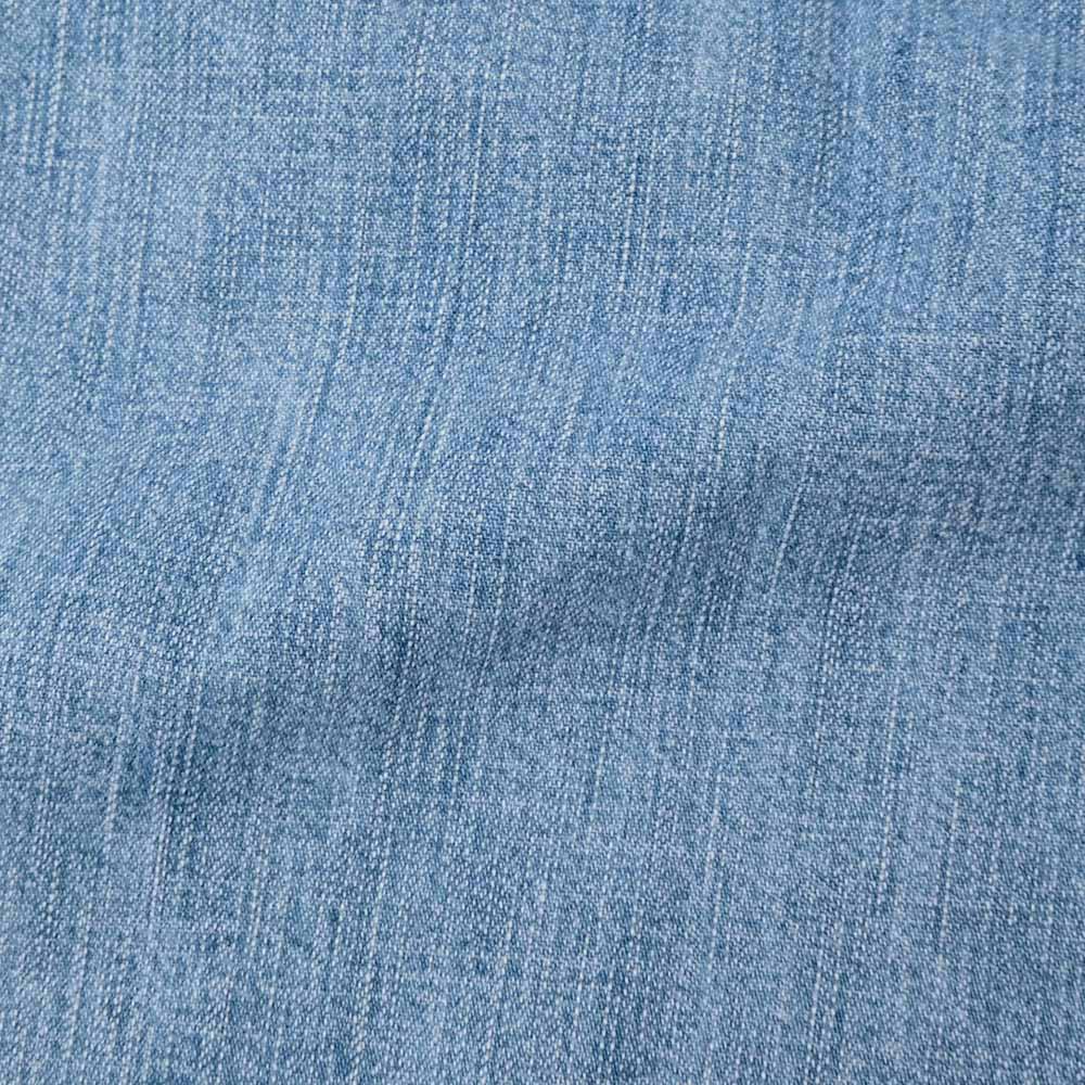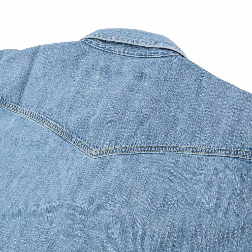 • This denim shirt from REMI RELIEF has been modified with a modern look for length and silhouette, while retaining the authentic details of the western shirts. The fabric is 8 oz. denim woven on an old-style shuttle loom, with khaki-colored warp to add rich depth to the denim. The careful fading process gives it a very supple and soft texture. The one-point studs on the collar and hem are carefully attached one by one by hand by craftsmen. The silhouette is a clean, sharp fit, easy to use as innerwear as well.