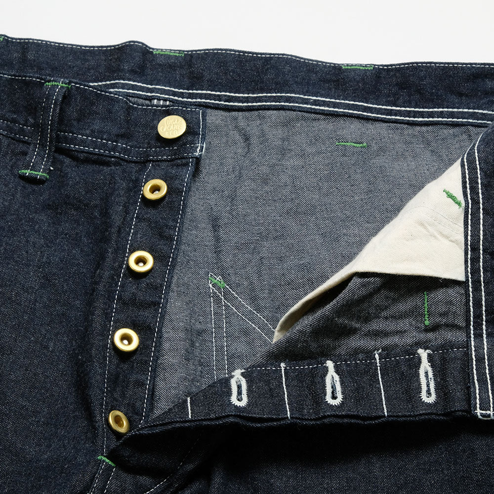 • Work shorts made of 11 oz. blue denim woven on a shuttle loom with rope-dyed indigo yarn for the warp and gray yarn for the weft. The pocket bag's fabric used is a special sleek with the bottom part woven at 28% higher density than the normal part to increase its strength without using a reinforced fabric.