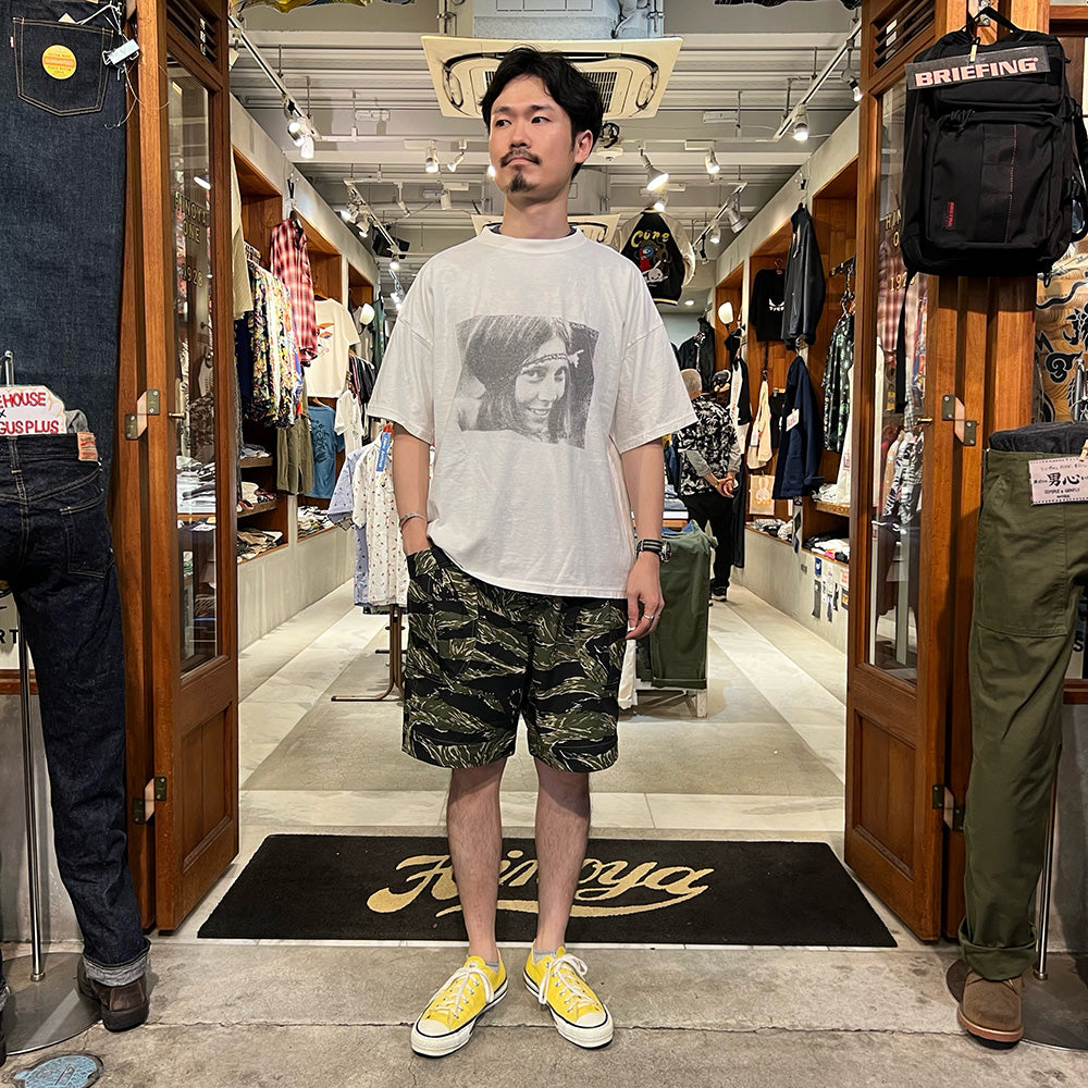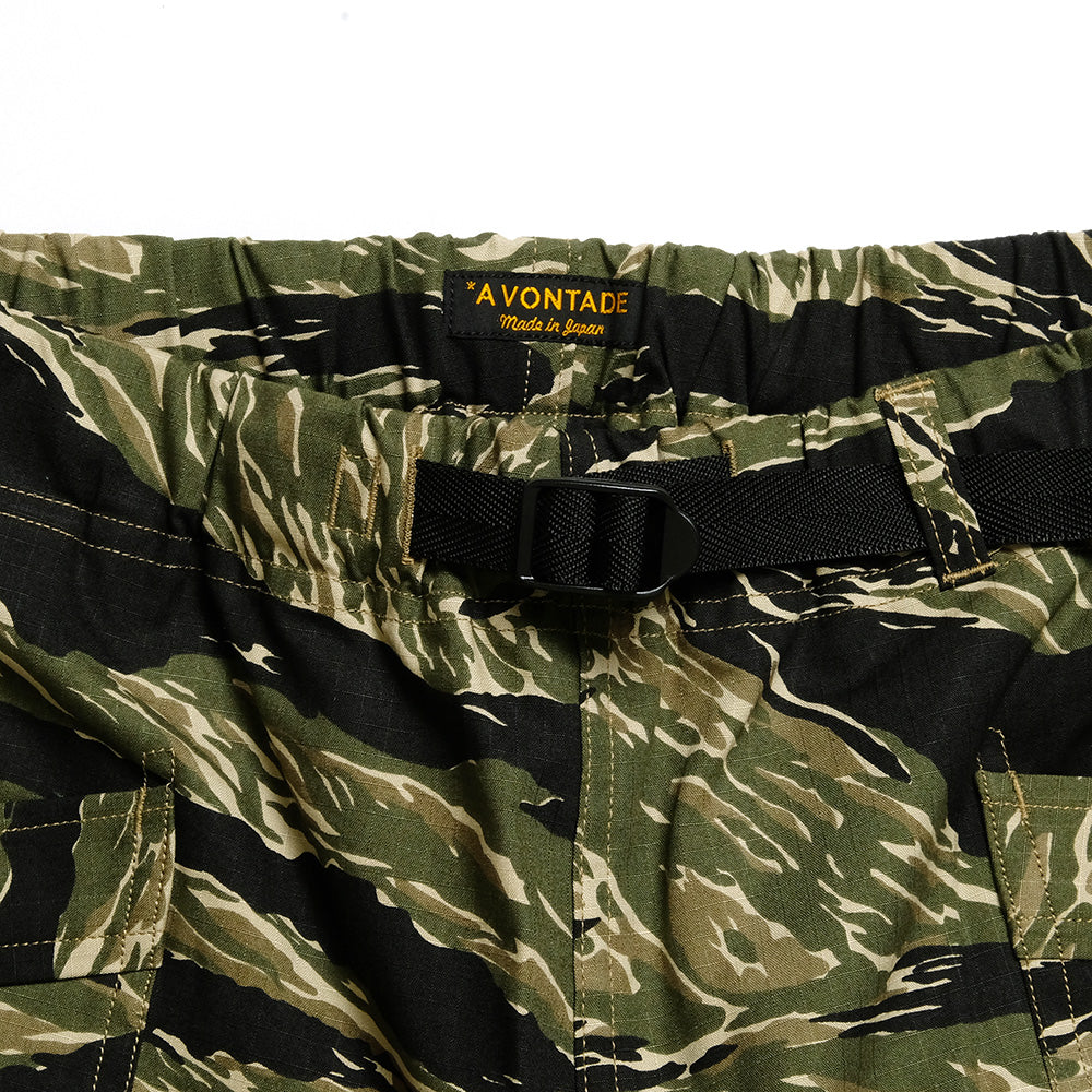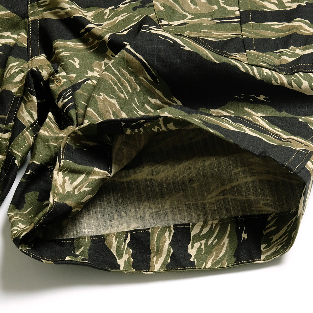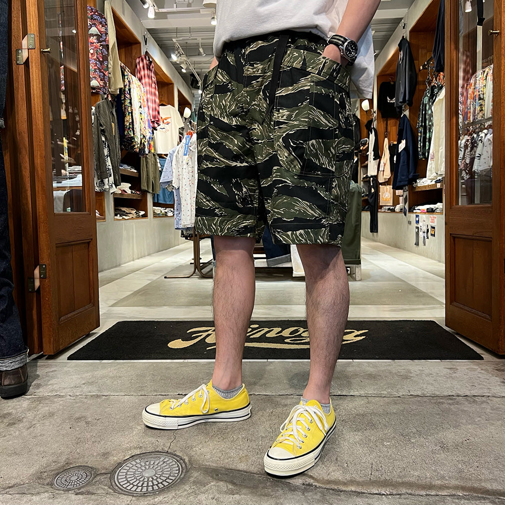 • These Fatigue Shorts have a webbing belt for adjusting waist fit. The material is lightweight, non-sticky cotton ripstop. The silhouette is slightly deep rise and roomy from the hip to the thigh. The inseam has a gusset like that of climbing pants for easy movement. It features large front pockets with wide, bulging pocket openings. The military-like tiger camouflage pattern accents your outfit.