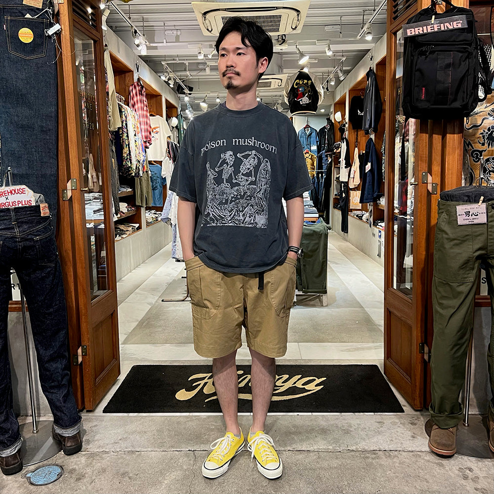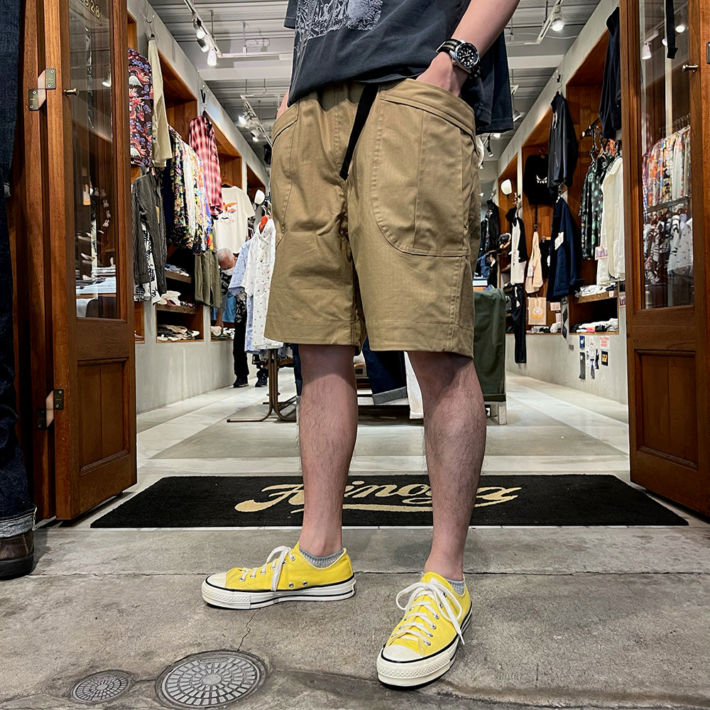 • These Fatigue Shorts have a webbing belt for adjusting waist fit. The material is lightweight, non-sticky cotton ripstop. The silhouette is slightly deep rise and roomy from the hip to the thigh. The inseam has a gusset like that of climbing pants for easy movement. It features large front pockets with wide, bulging pocket openings.
