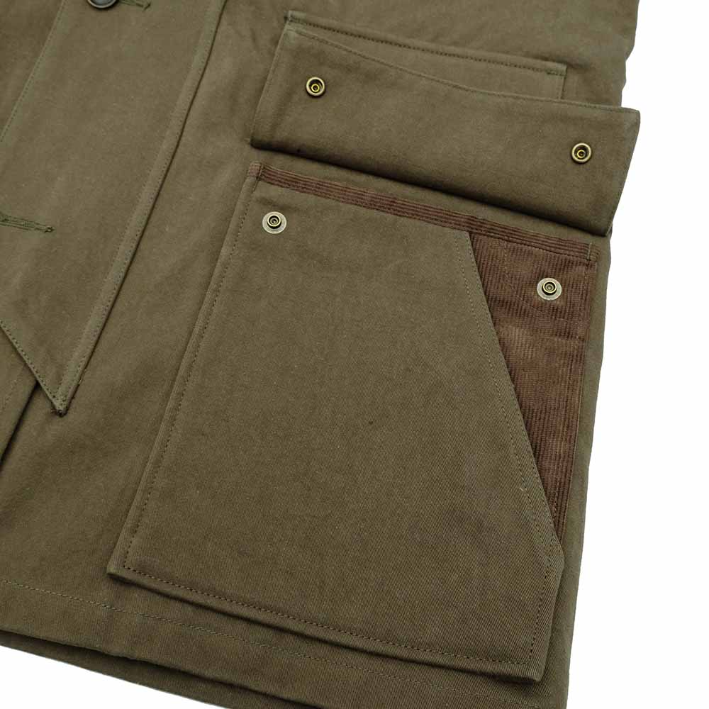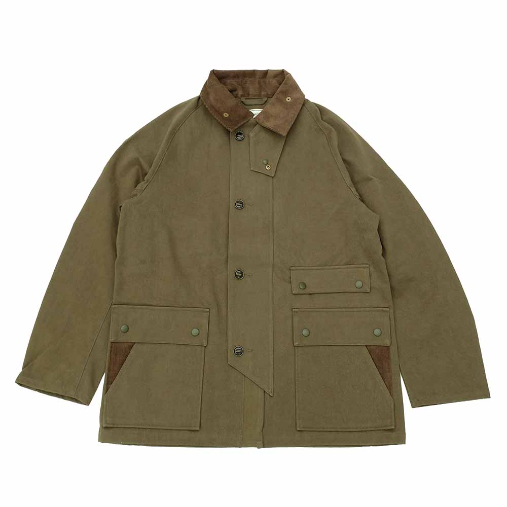 • This coat is a re-design based on a field coat with a British country image, fusing details of fireman's coats and military coats. In addition to waist pockets with hand warmers, it has a ticket pocket, a zippered pocket behind the front placket, and an inside pocket for high storage capacity. The outer fabric is an original chino cloth finished by a dyeing method that minimizes the use of singeing and other processes during the dyeing process to bring out the best of the material. It has a vintage-like texture that has aged over time. Corduroy is used for the collar and waist pocket hand warmers. This coat with chin warmers, inner cuffs, and other details for ease of use is suitable for heavy use.