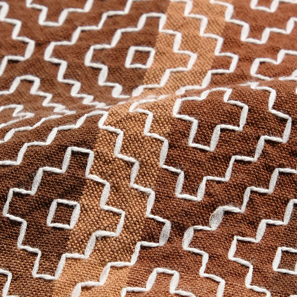 • This shirt is made of the original material "Persimmon-Tanned Noragi(Workwear) Sashiko." By adjusting the persimmon tannin dye and the number of dyeing cycles, three shades of persimmon-dyed yarns were created to express the plaid pattern. This pattern, made with Sashiko running vertically and horizontally, is the persimmon leaf motif, a traditional Japanese Sashiko design. It was washed at high temperatures, utilizing the difference in shrinkage rate between the yarn count and the fabric to express a fullness reminiscent of hand-stitched Sashiko.