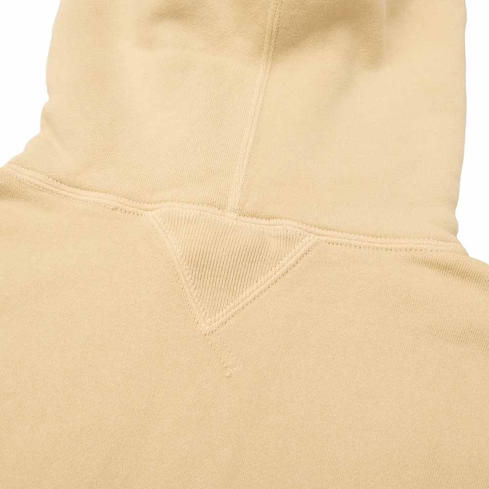 • This hoodie is made of an original fabric created on a sinker machine at a factory in Wakayama Prefecture, also sewn in Wakayama, and dyed and printed in Okayama. The fabric with brushed lining is warm, and the hoodie is made with attention to detail, such as the vintage specifications of V-gussets on the neck of the front and back.