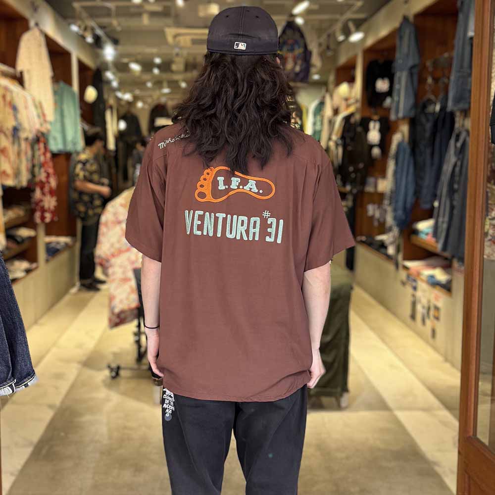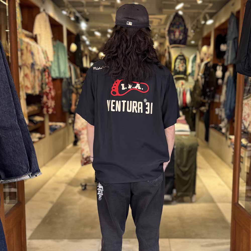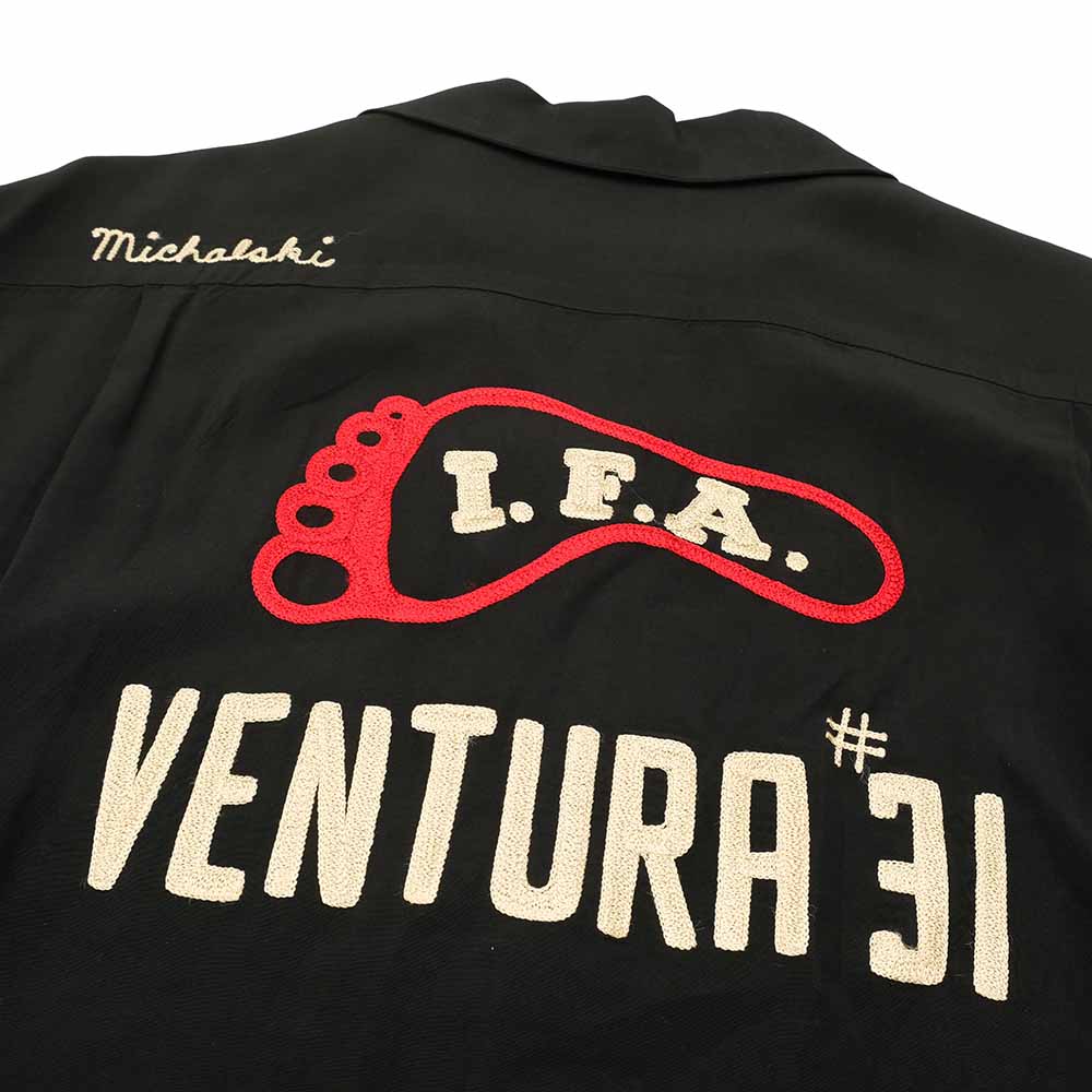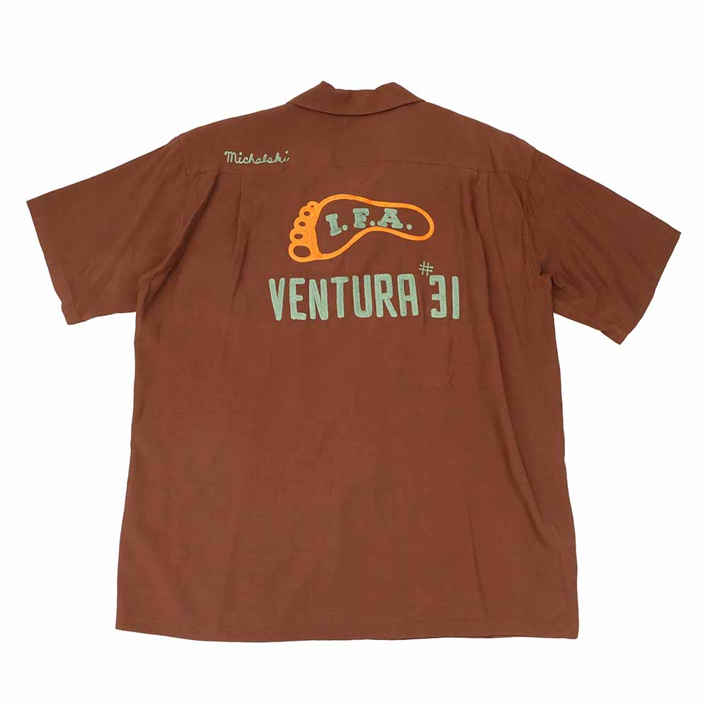 • This bowling shirt is based on vintage shirts made in the mid to late 1950s. The body is made of lightweight 100% rayon plain weave fabric, and the bowling pin motif buttons seen on bowling shirts from the 1950s are used. The left chest and back have an all-chain embroidery design typical of bowling shirts. The bowling shirts with a simple design are a popular standard item for every season, as they can be used for various outfits.