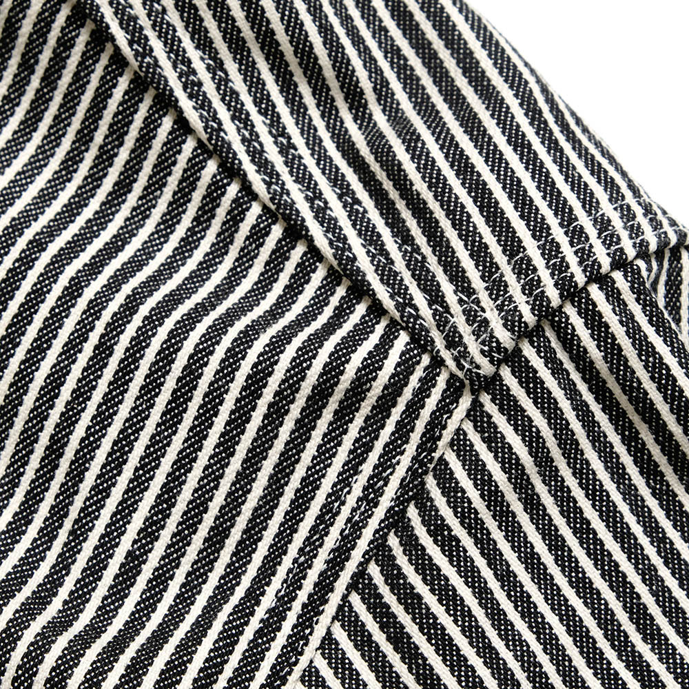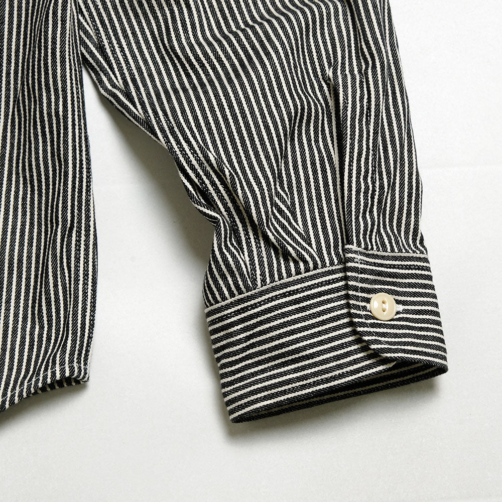 • This simple hickory stripe shirt is made with details of vintage work shirts, such as heavy fabric woven with thick yarns, pockets with flaps on both chests, cat-eye buttons, and lap-fold triple-needle stitching.