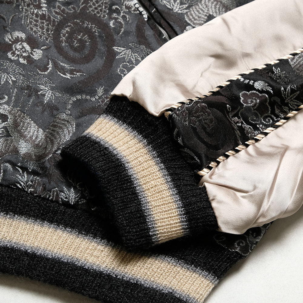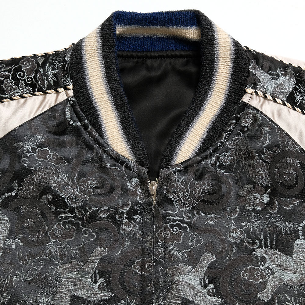 • This "Brocade" souvenir jacket is a special edition commemorating Toyo Enterprises' 60th anniversary. Among countless vintage Sukajan, this item is exceptionally rare, featuring patterns expressed through weaving rather than embroidery. Depicted in gleaming silver thread on a black body are ancient Japanese motifs: bamboo, tigers, thunderclouds, and dragons. Around the early 1950s, brocade fabric woven in historic textile regions of Kanto—such as Kiryu in Gunma Prefecture and the Gunnai area of Fujiyoshida in Yamanashi Prefecture—was used as one variation for Sukajan. This is an ultra-rare collector's item, coveted even more than the super-rare skull patterns or hand-printed designs.