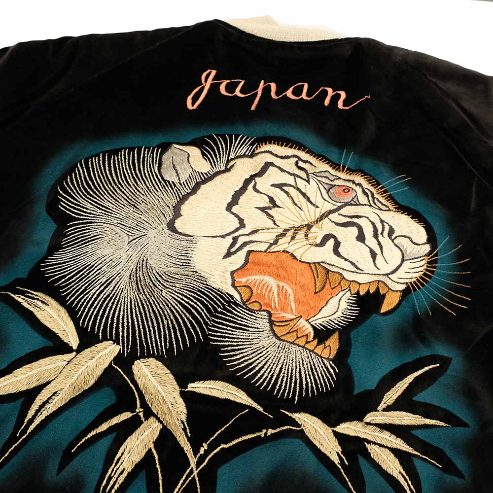 The embroidery features a mid-1950s design known as the "Tiger Head", with blue stenciling around the white tiger's face, creating a powerful effect that seems to pop out from the black velveteen. The undulating mane is carefully drawn one by one, with the needle position changed many times, and the bloodshot eyes are emphasized with red embroidery thread.