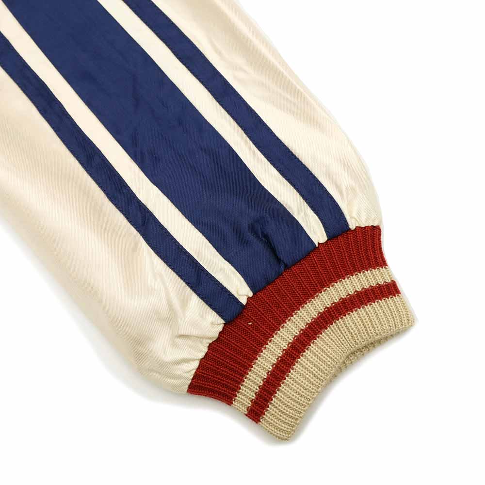• Tailor Toyo has reproduced the Sukajan(Souvenir jacket) with the Alaskan pattern, commonly known as the “Alaskan Sukajan”, which is extremely rare and popular among vintage jackets. The main side is based on a vintage jacket from the late 1950s, with a lightning bolt and a white bear on the chest, and a bald eagle soaring above the ice floes and Mount McKinley embroidered on the back. Alaska, with its pristine wilderness, is known as "America's Last Frontier," and its message is also embroidered on the lower part of the back. It also features a tricolor body reminiscent of the Stars and Stripes and the three lines on the sleeves typical of the Alaskan Sukajan.