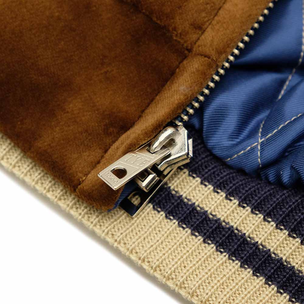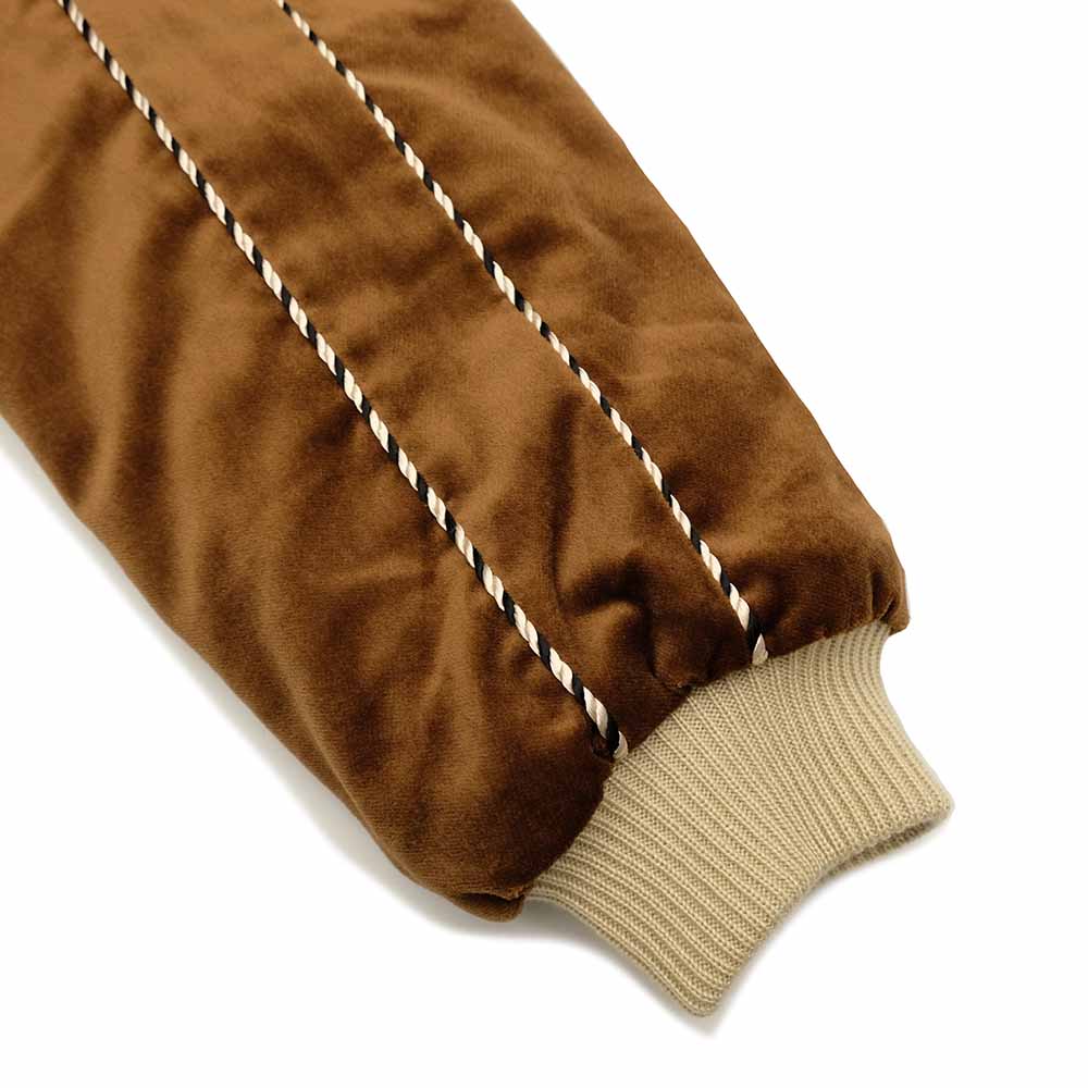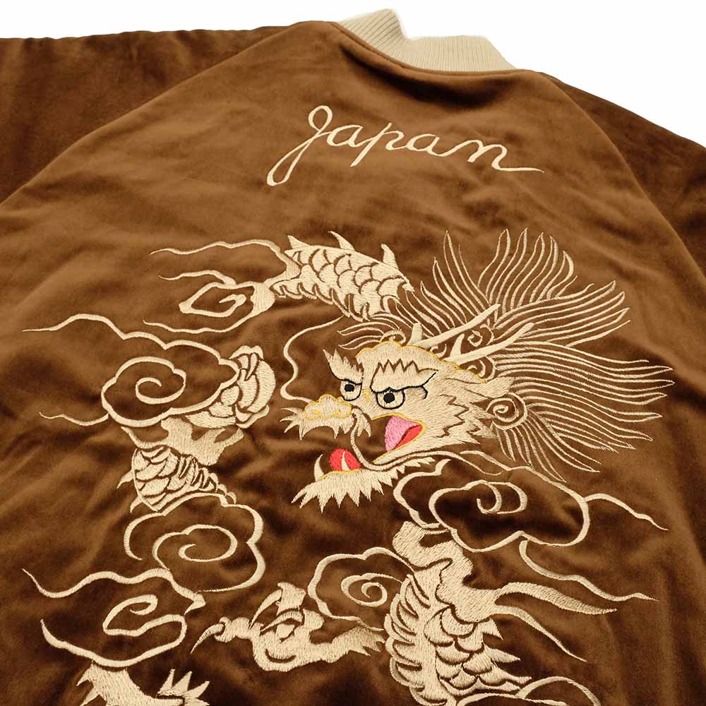 • This Sukajan(Souvenir Jacket) is made of brown velveteen fabric, which is rare even among vintage Sukajan. The design of the white dragon, with a body so long it seems to peek through the clouds, is a reproduction of a mid-1950s vintage piece. The dragon, its mane flowing as it flies through the vast sky, is embroidered in a three-dimensional style using white-based colored threads, and the use of different colors in parts, such as the yellow edging and the red tongue, adds impact.