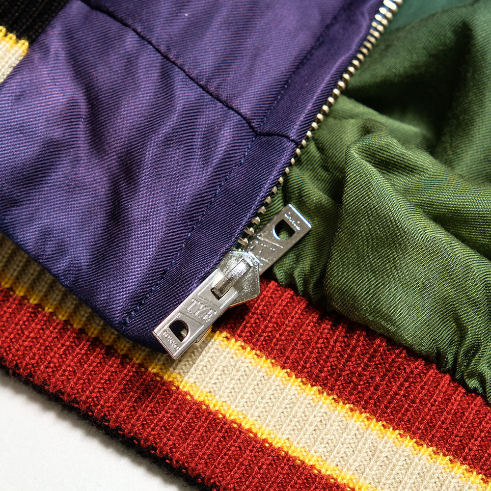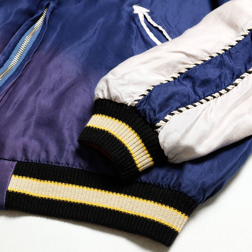 • Tailor Toyo has reproduced the "Skull Pattern" Sukajan(Souvenir Jacket) as an aging model. The number of vintage examples still in existence is extremely limited, and they trade at unbelievable prices on the market. While some skull patterns are embroidered with colorful threads, this mid-1950s piece is crafted with pale-colored threads based on white, creating a sophisticated finish that stands out in contrast to the faded navy body.