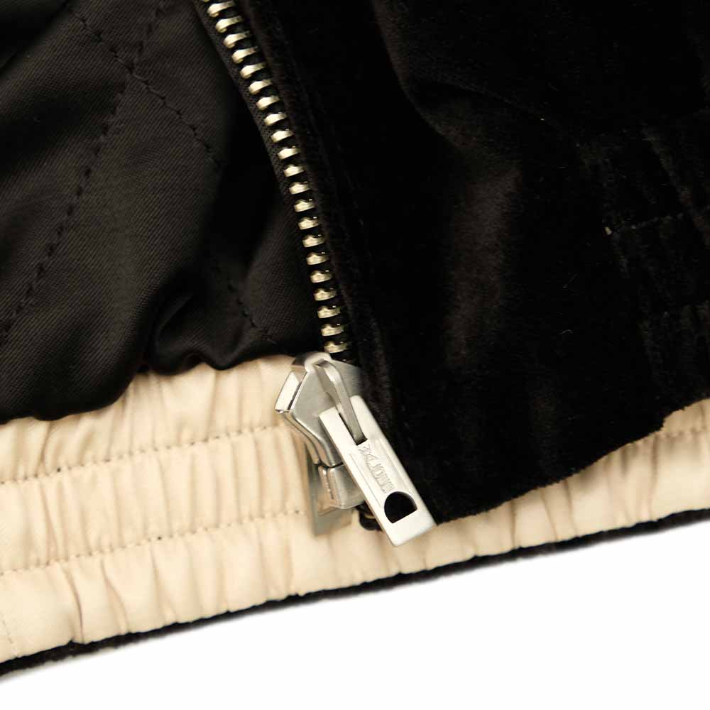 • A zip blouson embroidered with nostalgic and beautiful Japanese landscapes, following traditional Japanese techniques. This quality stands apart from the embroidery seen on the archive Sukajan(Souvenir Jacket), featuring meticulously designed precision to the limit: thread thickness, number of colors, gradation, shading techniques, and completely original nostalgic motifs. Also, you can enjoy different looks, with the beautiful solid-color, lightweight velvet side and the unique two-tone rayon quilted side. The velveteen, often seen on archive souvenir jackets, has been upgraded to organic cotton. This velveteen, typically thick, has been meticulously manufactured to its thinnest possible specification, and is woven slowly on shuttle looms, creating its signature drape, fullness, and lightweight feel.