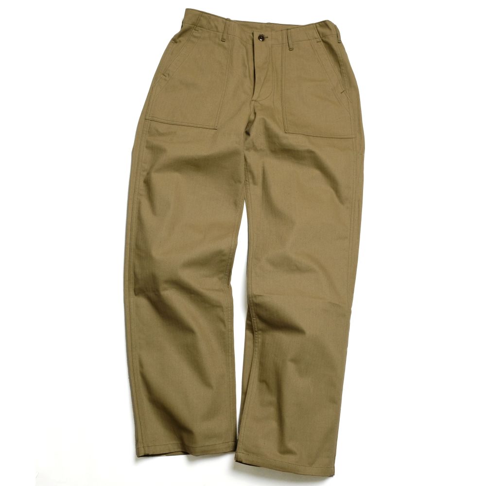 • "WAREHOUSE" reproduces the baker pants used by the U.S. Army. The fabric is cotton herringbone woven on a power loom. It has a moderate thickness and stiffness texture and can be expected aging. The fit is a rugged, slightly wider style typical of military pants. The silhouette is moderately tapered and can be easily matched with sneakers as well as boots.