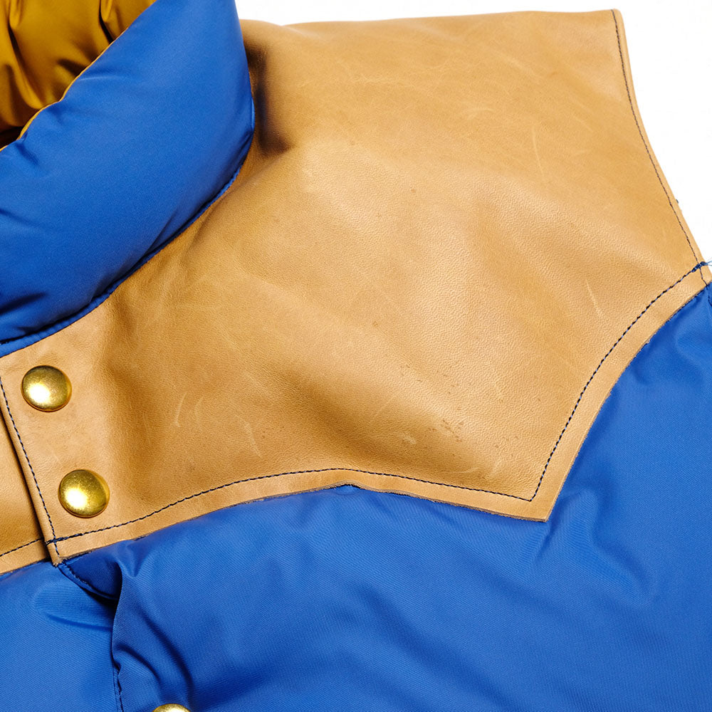 • A nylon down vest collaboration between WAREHOUSE and Rocky Mountain Featherbed. The outer shell and lining are made of 70-denier nylon taffeta, finished with a color scheme inspired by vintage outdoor wear. The yoke is made of horsehide provided by WAREHOUSE. You can enjoy the unique aging characteristics inherent to horsehide. The taffeta construction with down pack functionality prevents down from shifting. It will surely become a reliable item from the early chill through the middle of winter.