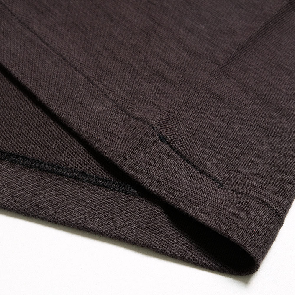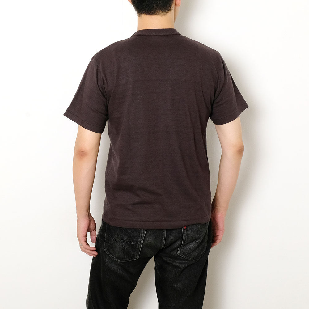 • This standard T-shirt from "WAREHOUSE" is knitted on an old-style low-gauge knitting machine, which is said to be "rarer than a loop-wheeled knitting machine. The fabric is called "shadow border" because it is woven with a 12-count uneven yarn to produce a unique shade, and even though it is a plain T-shirt, unevenness like a horizontal border appears faintly. The collar part adopts a binder neck. Instead of a modern neckline that is extremely low in the front, piping is applied to the circular rib fabric to maintain its strength, and the more it is worn, the more the neckline loosens and naturally falls.