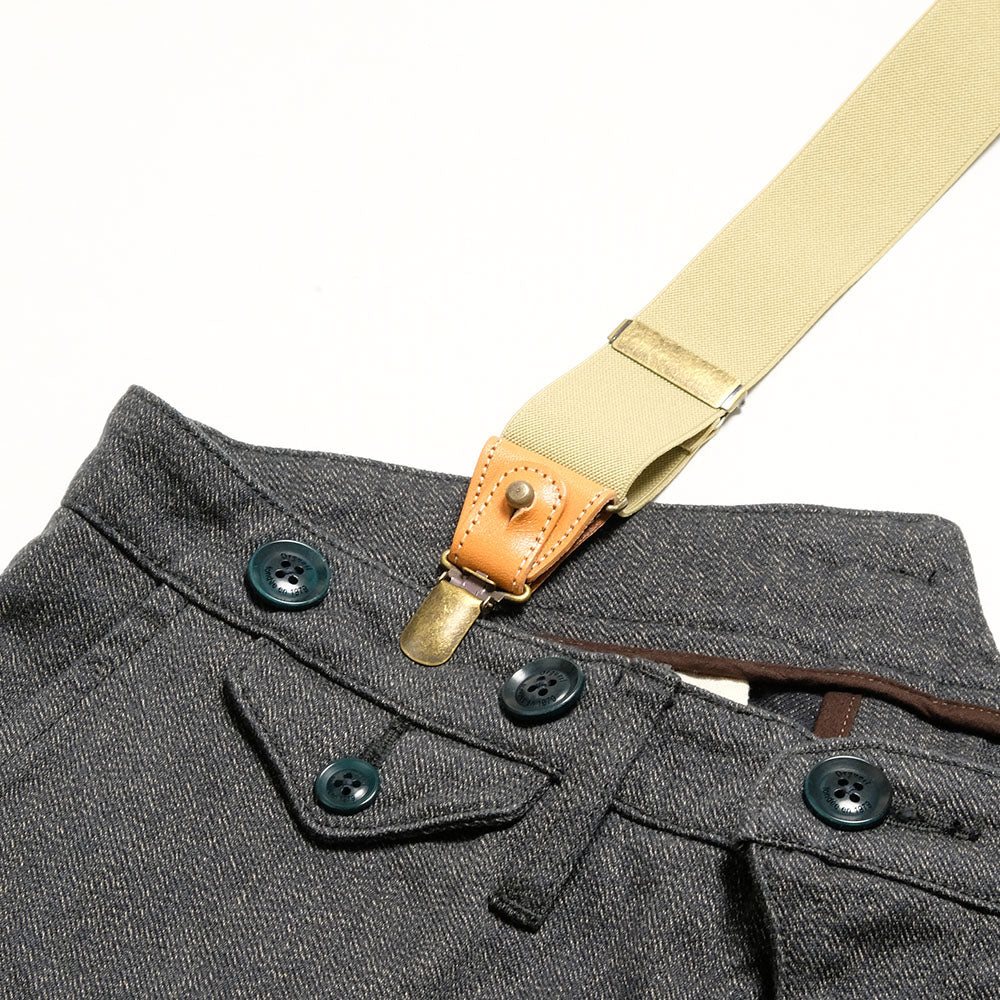 • The "Orgueil" standard item, the suspender, is made of 35mm wide elastic and carefully sewn leather parts, giving it a heavy impression. You can attach the suspenders to your pants with either a button or a clip, and six buttons are included for pants without buttons.