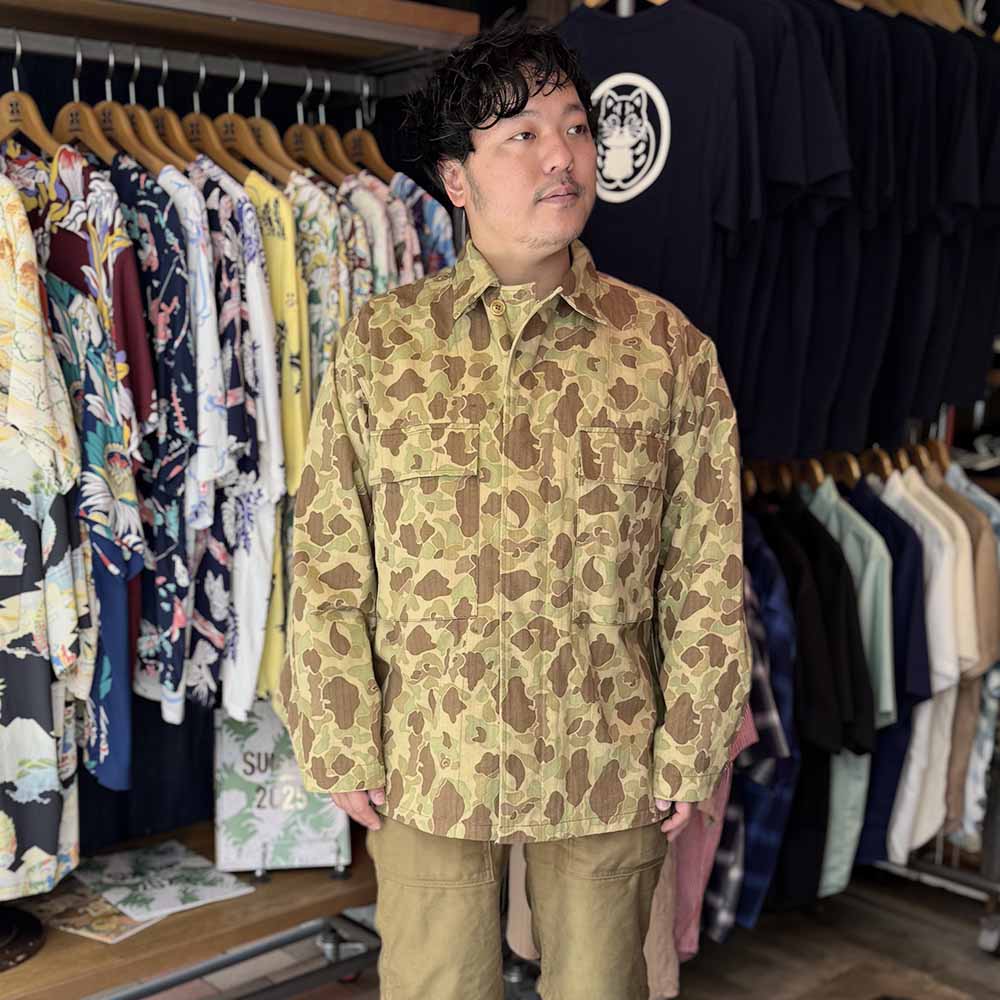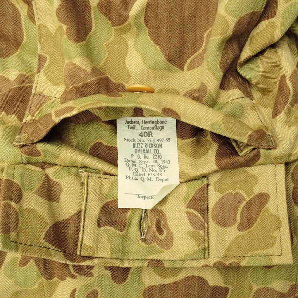 • This herringbone twill jacket is reproduced by "Buzz Rickson's", based on vintage jackets. Herringbone twill, known for its density and strength, was suitable for combat uniforms and gas protective clothing. To enhance camouflage effects, the U.S. Army adopted a camouflage pattern printed on both sides of the fabric—green on one side and tan on the other—in 1942. However, the fabric was not designed to be reversible. The chest has a large vertical pleated pocket, and the elbows are reinforced with double layers. A gas flap, designed to improve sealing against poison gas infiltration, is located under the front placket, all placed on the green side. The tan side is plain. The design closely resembles the olive drab M-43 uniform adopted around the same time, but buttons are concealed to prevent snagging on equipment or while crawling on the ground.