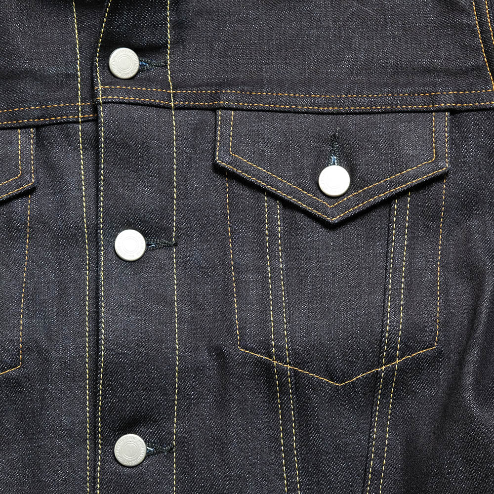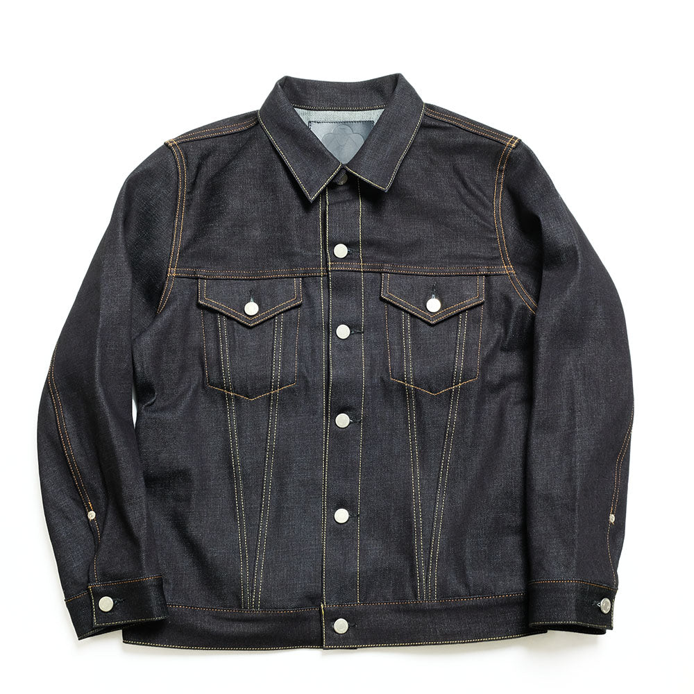 • "MOMOTARO JEANS" proposes a new standard series that is not to be influenced by trends. It is the “TOKUNO (Extra Dark) BLUE”. To express the unique beauty of rigid jeans to the fullest, "MOMOTARO JEANS" has highlighted the beauty of indigo by using different yarn counts for the warp and weft yarns and adjusting the number of warp and weft yarns. Another feature of these jeans is that the shrinkage caused by washing, which is characteristic of rigid denim, has been suppressed. Applying a special sanforized process makes this jacket softer and more comfortable to wear than general rigid jackets, and the shrinkage after washing is set within 1%. "#003 DENIM JACKET" is the tightest-fit jacket among "MOMOTARO JEANS" jackets. It features a narrower sleeve. It has smart, easy-to-use side pockets. This timeless and universal denim jacket is achieved by adopting a pattern that pursues a beautiful silhouette and comfortable fit.