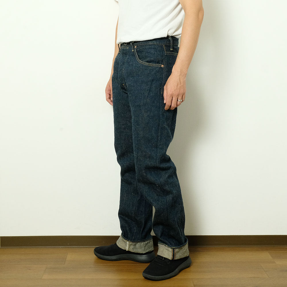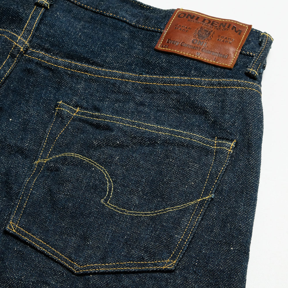 • The manufacturing process, the factory, and everything about "Oni Denim" are veiled in secrecy. The denim has a greenish-indigo color that looks as if it were found in dead stock and has a super rough texture. It has a texture too peculiar to be called denim. What is barely discernible is the strength of the "nep" of the yarn. The extra-thick yarn used was specially ordered by "Oni Denim". The yarn is not only thick but also uneven. The tension of the yarn is reduced to the limit in the weaving process, resulting in a coarse fabric despite its heavy weight of 20 oz. The warp yarn is made of indigo with strong unevenness. In contrast, the weft is unbleached yarn (ecru). The combination of these two yarns creates a deep and unique feel. The selvedge is inspired by the colors of the Kabuki curtains, with "yellowish green" and "persimmon". The silhouette is a relaxed straight. It is a traditional straight fit with moderate roominess overall.