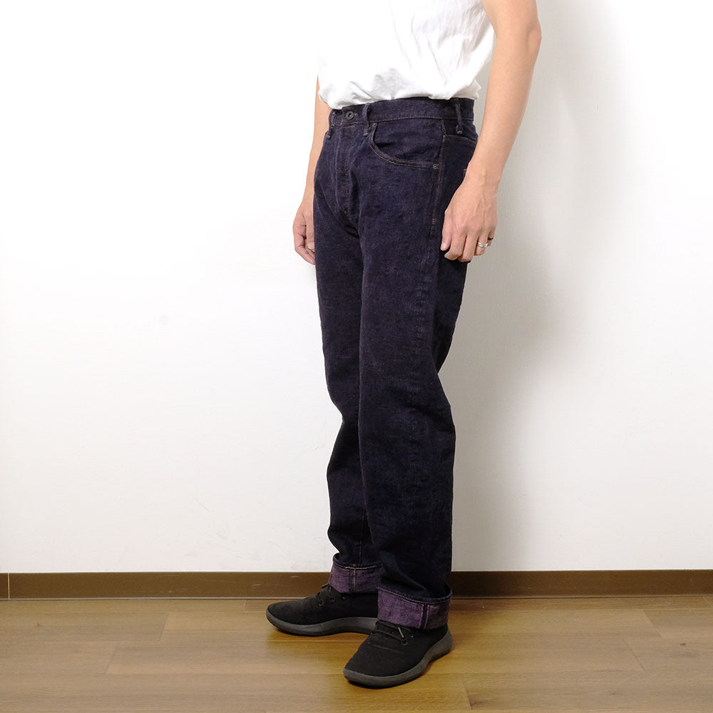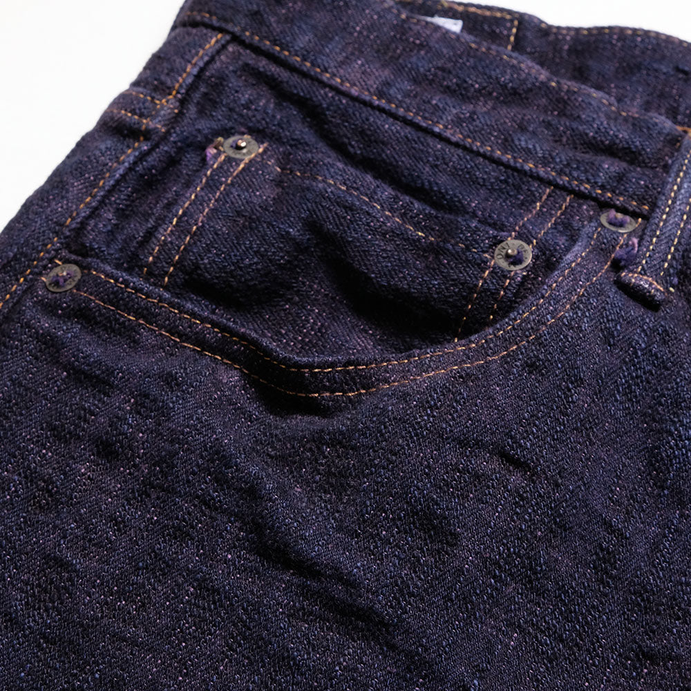 • "Oni Denim" has newly developed the "Bumpy Denim" for the 17oz straight jeans. Woven with ultra-low tension using extreme slub yarn, this pair has a unique, uneven texture and a wavy appearance. Furthermore, garment dyeing achieves a deep "Murasaki (Purple) Color". It is a unique jeans with a “one and only” presence, typical of Oni Denim. The silhouette features the new “Just Right Straight” fit—a middle silhouette between regular and relaxed. This new standard model from Oni Denim blends vintage feel with modern comfort. Recommended for those who want to take more time enjoying the aging process.