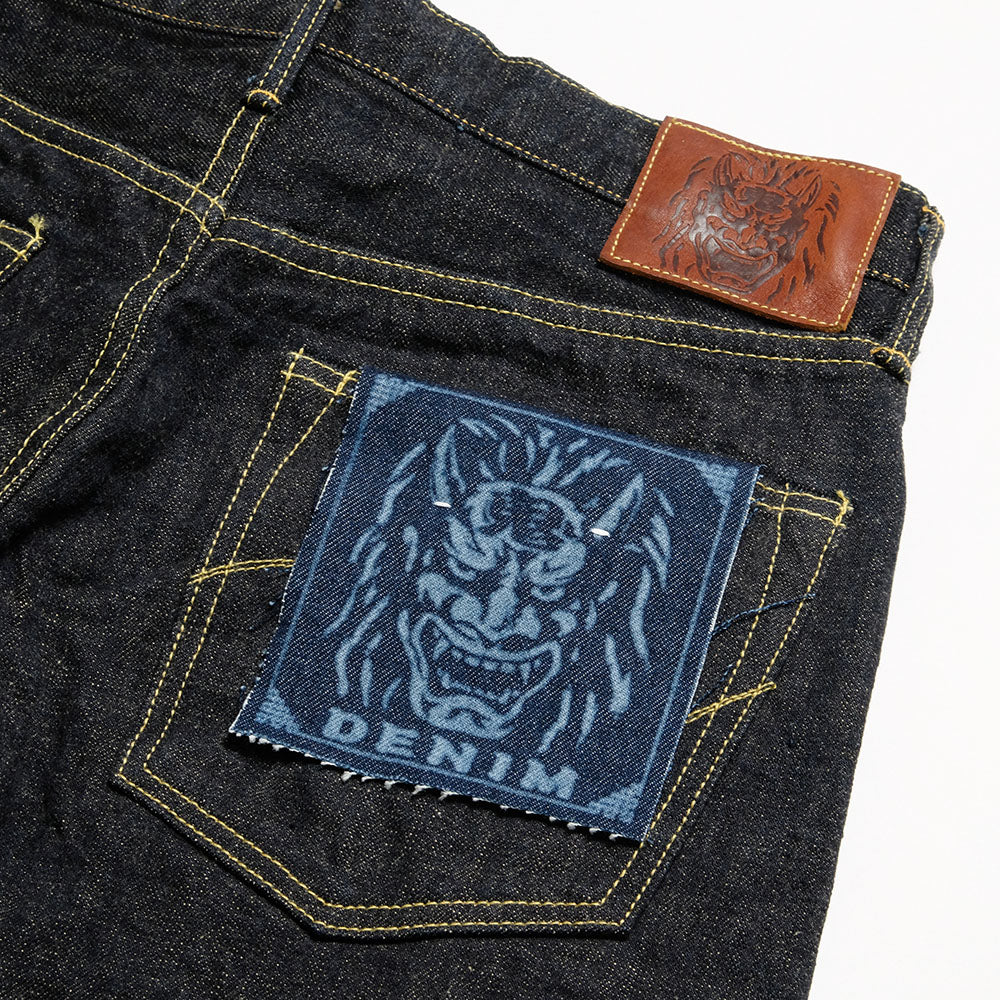 • The first jeans made by "Oni Denim" was a model commonly known as "Blue Oni. These jeans are a model that incorporates the spirit of the "Blue Oni" jeans. The 14 oz. selvedge denim has a rough, sandpaper-like texture and strong unevenness, reminiscent of the first "Blue Oni" jeans. Warp yarns are indigo and weft yarns are beige, giving it a vintage denim look. The denim allows you to enjoy color fading with clear shading. The fit is a neat straight silhouette. The standard rise and the thigh width, but the silhouette is sharply tapered from the knee to the hem, creating a neat silhouette. The right back pocket has a denim flasher just like the first "Oni" jeans. Like most paper flashers, it is supposed to be detached when worn, but some customers liked the powerful discharge printing design and wore it without detaching it.